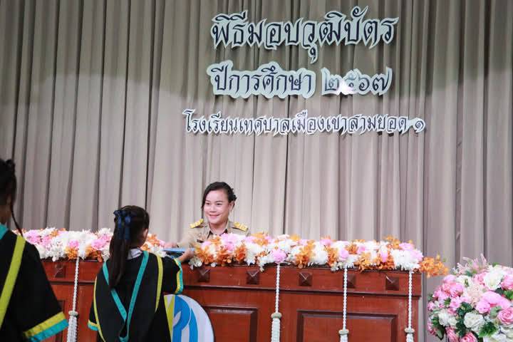 โรงเรียนเทศบาลเมืองเขาสามยอด1 จัดพิธีมอบวุฒิบัตรให้กับนักเรียนที่สำเร็จการศึกษาชั้นประถมศึกษาปีที่ 6และน้องๆชั้นอนุบาลปีที่ 3 ปีการศึกษา ๒๕๖๗ โดยมี นางสาววไลศิริ ปาตั๋น นายกเทศมนตรีเมืองเขาสามยอด เป็นประธานและให้เกียรติมอบวุฒิบัตรแก่นักเรียนที่สำเร็จการศึกษา ในครั้งนี้ด้วย