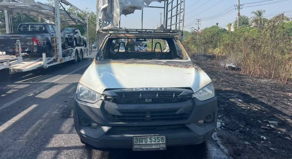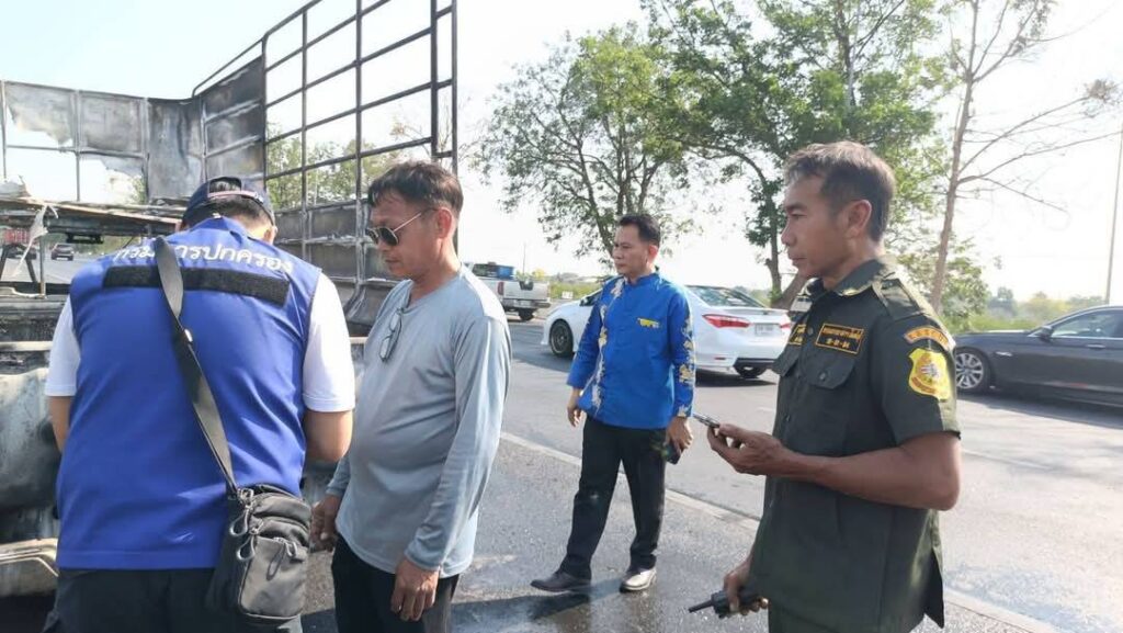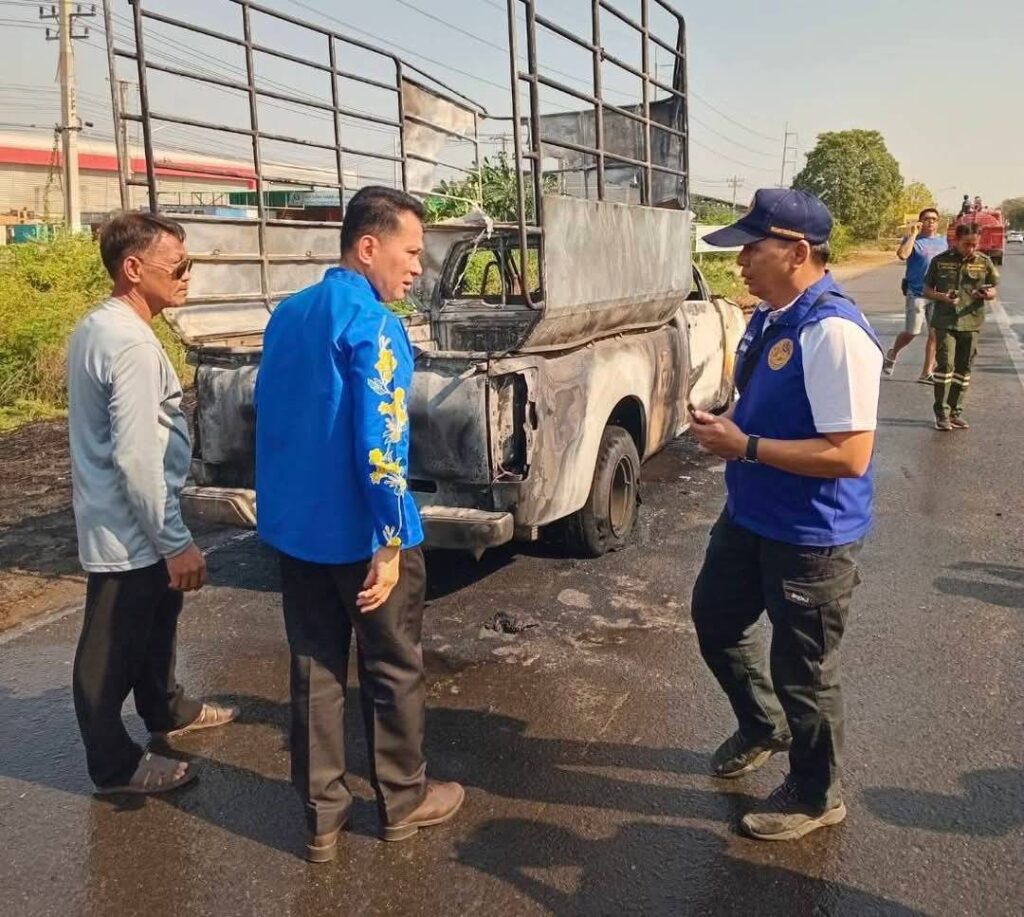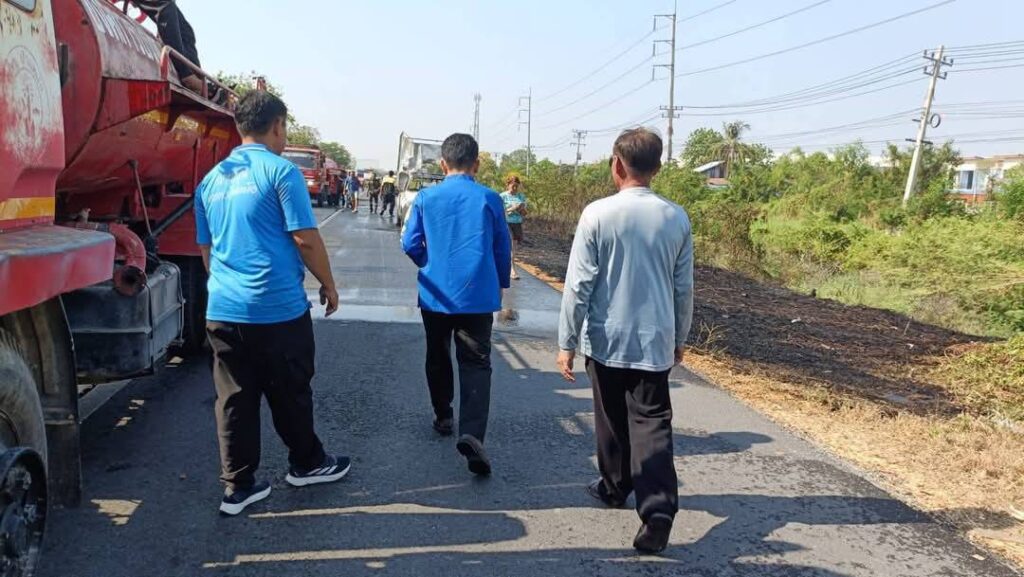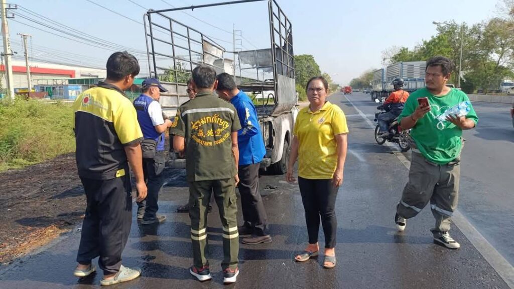 จากการสอบถามผู้ขับขี่ ชื่อ นายบุญช่วย ไสยอรรณ อายุประมาณ 60 ปี เป็นผู้ขับรถยนต์ของบริษัท ทียูเอ็ม เฟอร์นิเจอร์ ตั้งอยู่ที่ อ.กระทุ่มแบน จ.สมุทรสาคร หลังจากส่งเฟอร์นิเจอร์เสร็จสิ้น กำลังเดินทางกลับ จ.สมุทรสาคร เมื่อถึงที่เกิดเหตุ มีรถร่วมทางตะโกนบอกว่าไฟไหม้ผ้าใบที่คลุมหลังคารถ จึงจอดรถ ณ จุดเกิดเหตุ ไฟโหมทั่วทั้งคันอย่างรวดเร็ว สามารถควบคุมเพลิงได้ เวลาประมาณ 15.30 น. พนักงานสอบสวนและผู้ประกอบการติดต่อบริษัทประกันภัยดำเนินการหาสาเหตุของเพลิงไหม้ครั้งนี้ต่อไป