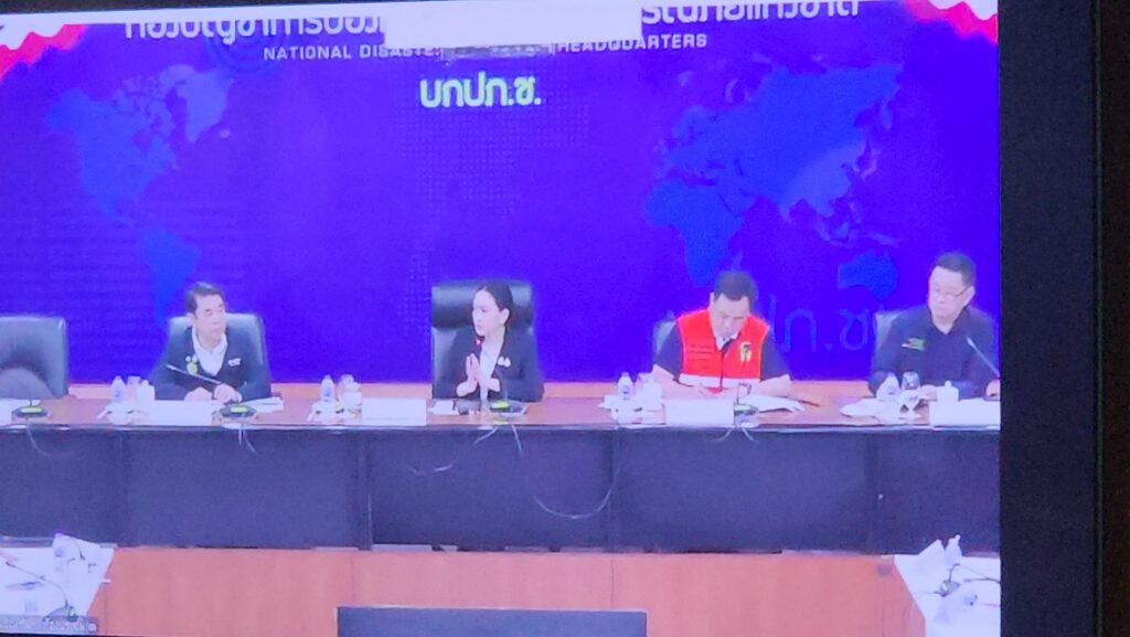 ต่อมาเมื่อเวลา 09.30 น. ที่ห้องประชุมข้าวหอมปทุม 4 นายสมคิด จันทมฤก ผู้ว่าราชการจังหวัดปทุมธานี พล.ต.ท.คำรณวิทย์ ธูปกระจ่าง นายกองค์การบริหารส่วนจังหวัดปทุมธานี พร้อมด้วยหัวหน้าส่วนราชการจังหวัดปทุมธานี เข้าประชุมด่วน vdo conference โดยมี น.ส.แพทองธาร ชินวัตร นายกรัฐมนตรี เป็นประธานการประชุมติดตามสถานการณ์การแก้ไขปัญหาแผ่นดินไหวร่วมกับหน่วยงานที่เกี่ยวข้อง โดยได้สอบถามถึงระบบการเตือนภัยแบบ SMS ที่มีปัญหาส่งช้าและไม่ทั่วถึงเพราะสั่งไปตั้งแต่ 14.00 น. แต่ระบบไม่ออก ซึ่งกรมป้องกันและบรรเทาสาธารณภัย ส่งให้ กสทช.เมื่อเวลา 14.42 น. หลังจากนั้น 14.44 น. ได้จัดส่ง SMS รอบแรก แต่มีข้อจำกัดส่งได้ 2 แสนเบอร์ ขณะนี้ส่งไปทั้งหมดกว่า 10 ล้านเบอร์ ตอนนี้ Operator พัฒนาระบบส่ง SMS ให้มากขึ้น และประสานกับค่ายมือถือกรณี Cell Broadcast (CBC)