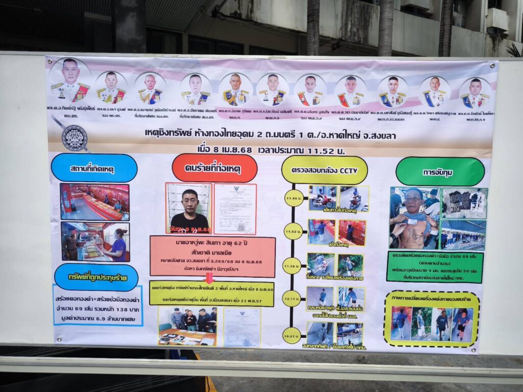 วันพฤหัสบดีที่ 10 เม.ย.2568 เวลา 10.00 น. ณ ตำรวจภูธรภาค 1 : พล.ต.อ.ธนายุตม์ วุฒิจรัสธำรงค์ ที่ปรึกษาพิเศษ ตร.พล.ต.ท.สุรพล เปรมบุตร ผบช.ภ.1 และคณะฯ ร่วมแถลงข่าวผลการจับกุมผู้ต้องหาเป็นชายชาวมาเลเซีย ก่อเหตุชิงทองที่ห้างทองไทยอุดม 2 อำเภอหาดใหญ่ จังหวัดสงขลา ชิงเอาสร้อยคอทองคำและสร้อยข้อมือทองคำที่อยู่ภายในร้านไป จำนวน 69 เส้น น้ำหนัก รวม 138 บาท มูลค่าประมาณ 6.9 ล้านบาท แล้วได้ขับขี่รถจักรยานยนต์หลบหนีไป