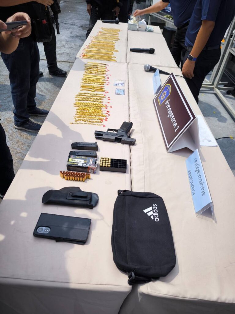 ร่วมกันจับกุมผู้ต้องหา นายอาหวู่พะ สินเกา หรือนายอนุชา แซ่โหยว หรือนายลี บุน ลง อายุ 62 ปี สัญชาติ มาเลเซีย ผู้ต้องหาตามหมายจับศาล จ.สงขลา ที่ จ.269/2568 ลงวันที่ 8 เมษายน 2568 พร้อมด้วยของกลาง สร้อยคอทองคำ จำนวน 38 เส้น,สร้อยข้อมือทองคำ จำนวน 31 เส้น,ตะขอสร้อย จำนวน 5 อัน,อาวุธปืนพกสั้นแบบออโตเมติก ขนาด 9 มม. ยี่ห้อ ซิกซาวเออร์ หมายเลขทะเบียนลบเลือน จำนวน 1 กระบอก,แมกกาซีนปืน จำนวน 2 อัน,กระสุนปืน ขนาด 9 มม. จำนวน 50 นัด,ซองหนังพกใน สีดำ 1 อัน,กระเป๋าสะพายแบบผ้า มีตราอดิดาส สีดำ ขนาด 30×19 ซม. จำนวน 1 ใบ,เป้สะพาย มีตราไนกี้ สีดำ จำนวน 1 ใบ,โทรศัพท์มือถือ ยี่ห้อ ออปโป้ สีดำ จำนวน 1 เครื่อง พร้อมซิมการ์ด จำนวน 1 อัน โดยกล่าวหาว่า “ชิงทรัพย์โดยมีและใช้อาวุธปืน และทำด้วยประการใดๆ เพื่อไม่ให้เห็นหรือจำได้ โดยใช้ยานพาหนะเพื่อกระทำความผิด เพื่อการพาทรัพย์นั้นไป หรือเพื่อให้พ้นจากการจับกุม,มีอาวุธปืนไว้ในครอบครองโดยไม่ได้รับอนุญาต และพาอาวุธปืนติดตัวไปในเมือง หมู่บ้าน หรือทางสาธารณะโดยไม่ได้รับอนุญาตและไม่มีเหตุอันควร”