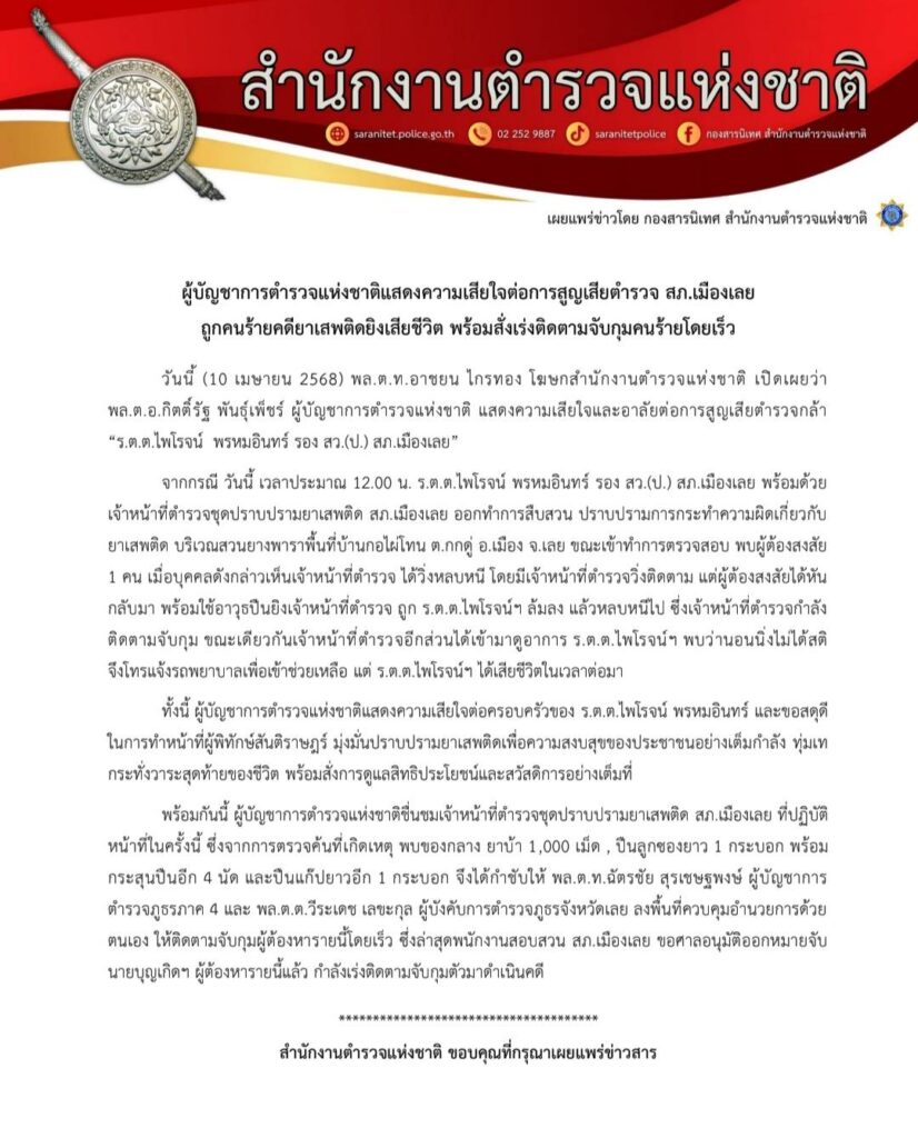 เมื่อวันที่ 10 เมษายน 2568 : พล.ต.ท.อาชยน ไกรทอง โฆษกสำนักงานตำรวจแห่งชาติ เปิดเผยว่า พล.ต.อ.กิตติ์รัฐ พันธุ์เพ็ชร์ ผู้บัญชาการตำรวจแห่งชาติ แสดงความเสียใจและอาลัยต่อการสูญเสียตำรวจกล้า “ร.ต.ต.ไพโรจน์ พรหมอินทร์ รอง สว.(ป.) สภ.เมืองเลย”
