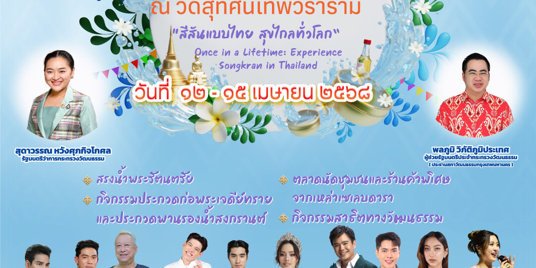 ชวนทุกท่านสนุกสนานไปกับสงกรานต์แบบไทย ในงาน สงกรานต์บ้านฉัน “สีสันแบบไทย สุขไกลทั่วโลก” เริ่มแล้ววันที่ 12 – 15 เมษายน 2568 ณ วัดสุทัศนเทพวรารามราชวรมหาวิหาร พบกับกิจกรรมสุดพิเศษ การแสดงจาก โอปอล – สุชาตา ช่วงศรี มิสยูนิเวิร์สไทยแลนด์ 2024 , พร้อมศิลปิน ดาราที่มาร่วมสืบสานประเพณีไทย โบ๊ท ธารา,ป๊อป ศิร์รัฐ , ป้าแจ๋ว ยุทธนา จากละครเรื่อง คุณพี่เจ้าขาฯ , ปีเตอร์แพน ทัศน์พล , แก๊ป จักริน จากละครเรื่อง หมอหลวง , กานต์ ณัฐชา , บิว ณัฐพล จากละครเรื่อง ฤทัยบดี