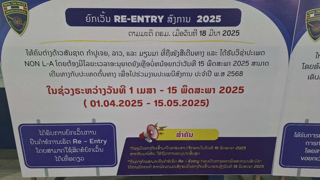 ซึ่งรัฐบาลสนับสนุนความสัมพันธ์ด้านแรงงานระหว่างไทยกับประเทศเพื่อนบ้าน รวมถึงช่วยลดภาระค่าใช้จ่ายให้แรงงานข้ามชาติ ที่ต้องการเดินทางกลับไปเยี่ยมครอบครัวและร่วมงานประเพณีสงกรานต์ในปีนี้โดยได้ผ่อนผันให้แรงงานชาวลาว ที่มีใบอนุญาตทำงานถูกต้อง ตั้งแต่วันที่ 1 เมษายน – 15 พฤษภาคม 2568ผู้ถือหนังสือเดินทางสัญชาติลาว ( VISA NON L-A และ VISA NON O L-A ) ที่ต้องการเดินทางกลับประเทศลาว ได้รับการยกเว้นไม่ต้องทำ Re-Entry (ไม่ต้องแจ้งรักษาสิทธิ์) สามารถเดินทางกลับประเทศเพื่อร่วมงานประเพณีสงกรานต์ได้ และให้เดินทางกลับเข้ามาในประเทศไทยภายในวันที่ 15 พฤษภาคม 2568 และสำนักงานตรวจคนเข้าเมือง ขอเรียนว่า ชาวต่างชาติที่จะเดินทางเข้ามาในประเทศไทย สามารถลงทะเบียน TDAC ผ่านทางเว็บไซต์ https:// tdac.immigration.go.th , https://tdac.in.th/th เท่านั้น “ และไม่มีค่าธรรมเนียมแต่อย่างใด” เริ่มใช้วันที่ 1 พฤษภาคม 2568 ที่จะถึงนี้