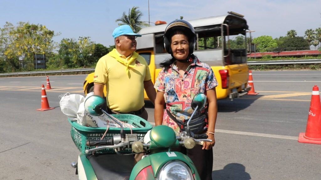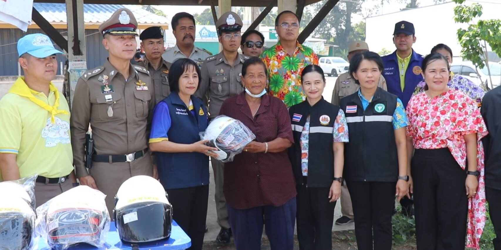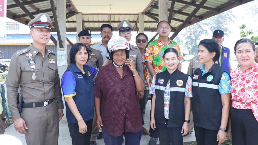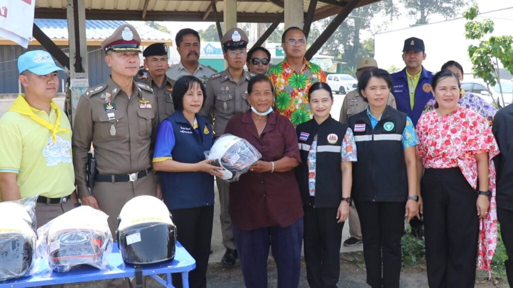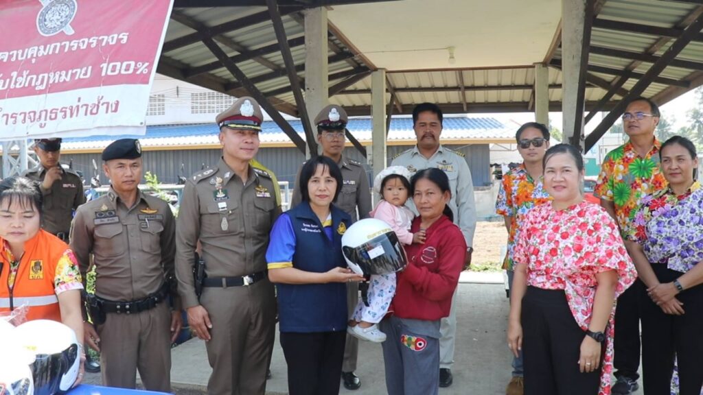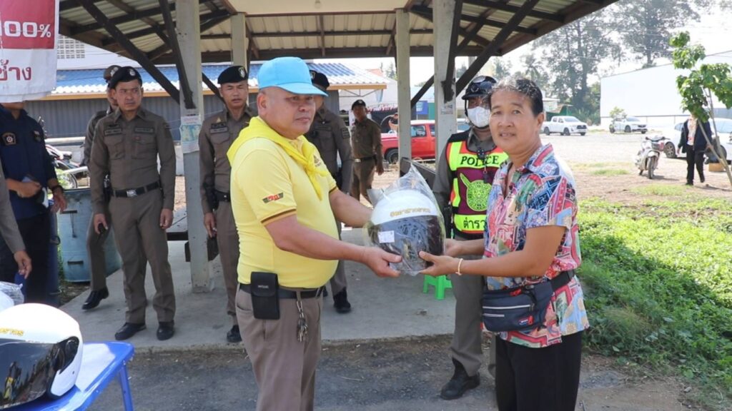 สถานีตำรวจภูธรท่าช้าง รับลูกสำนักงานตำรวจแห่งชาติในการรณรงค์ลดอุบัติเหตุจราจรทางบกแจกหมวกกันน็อคประชาชน
