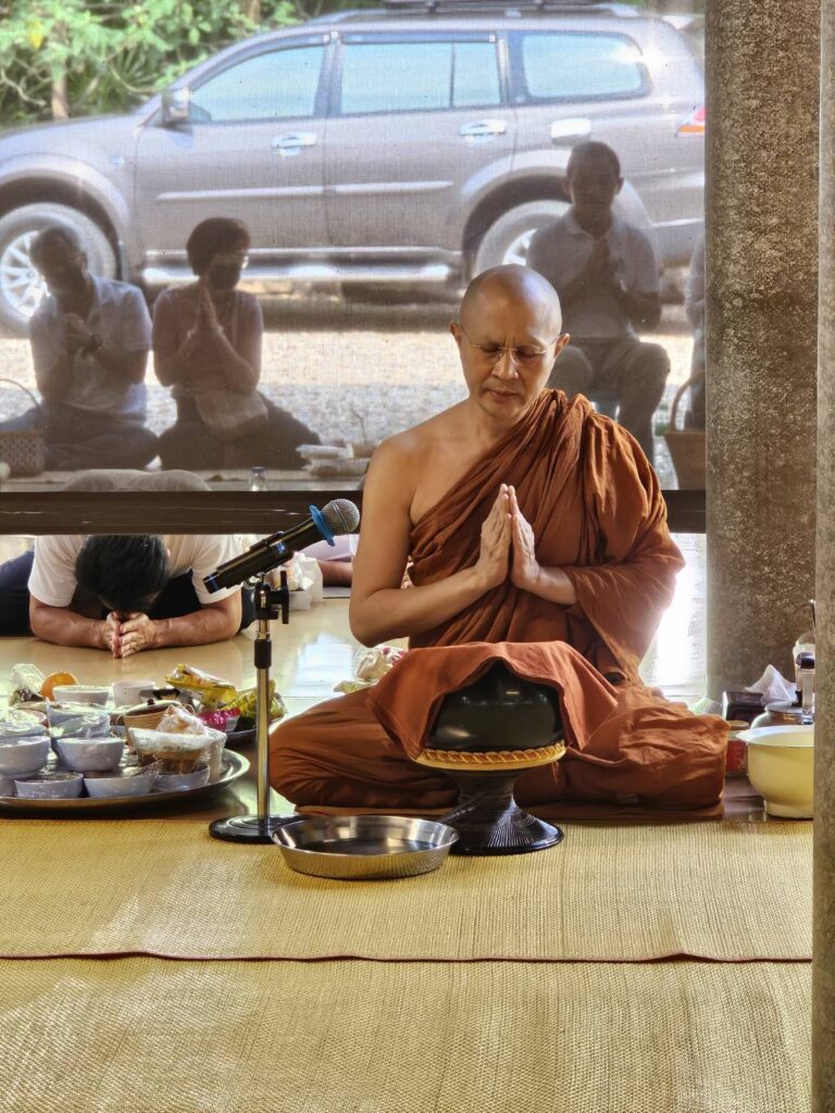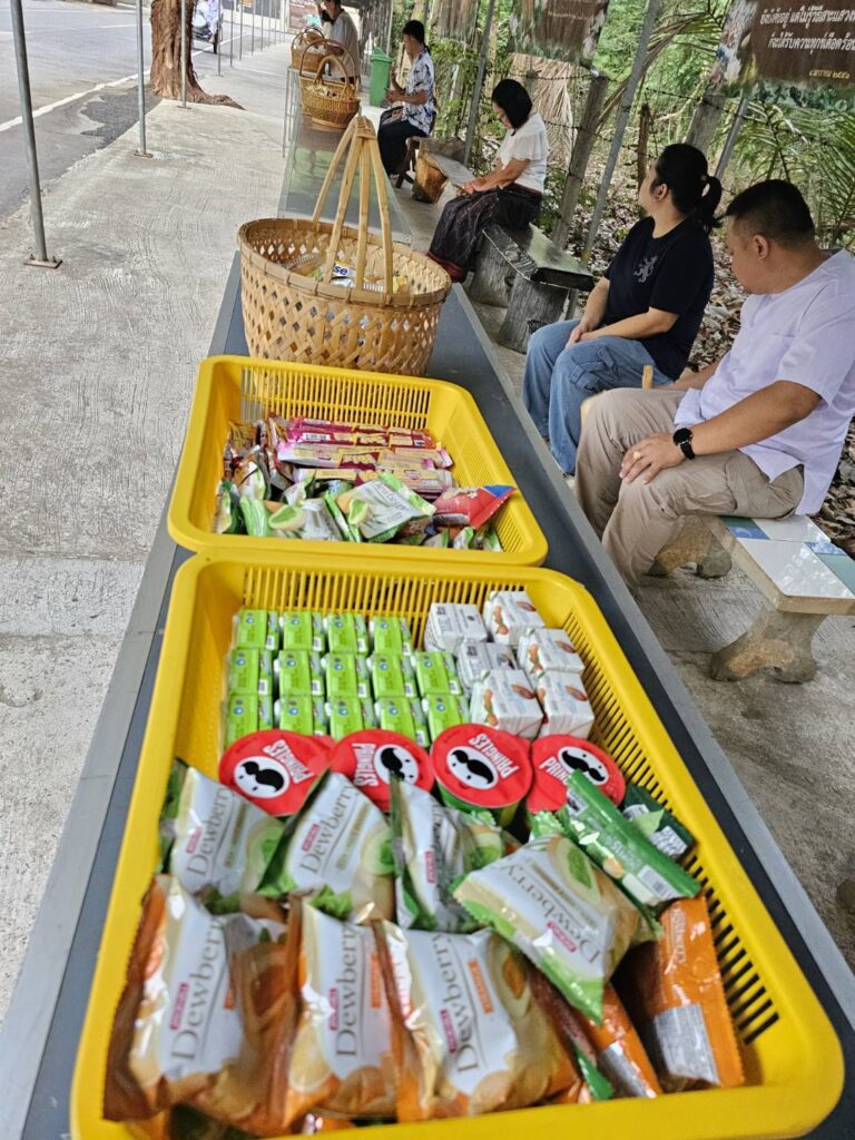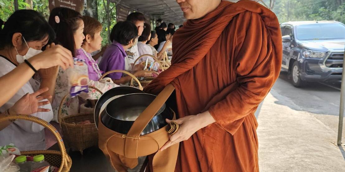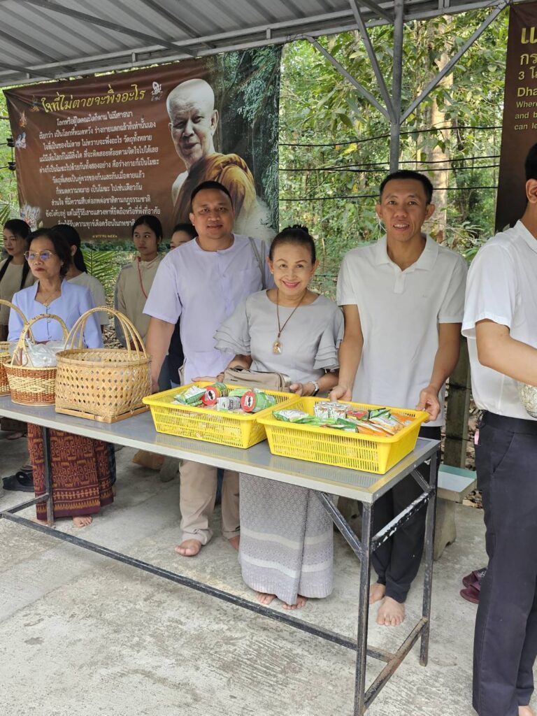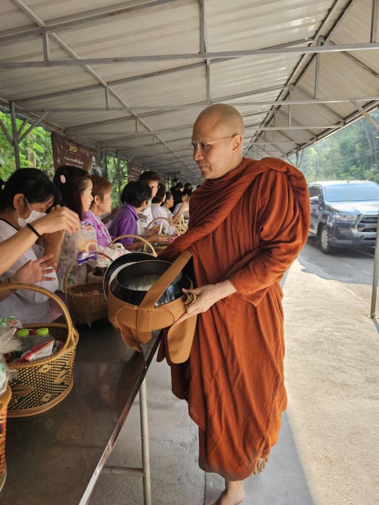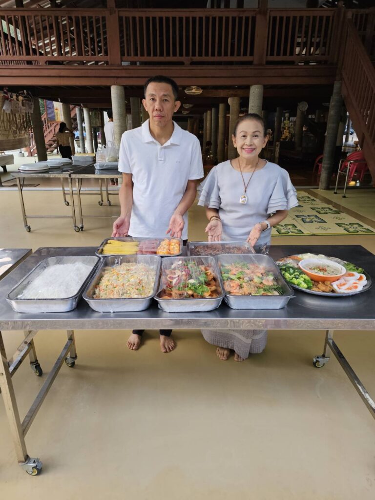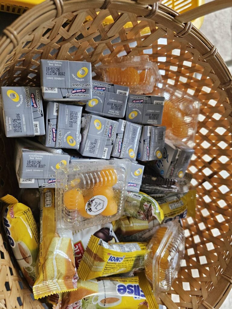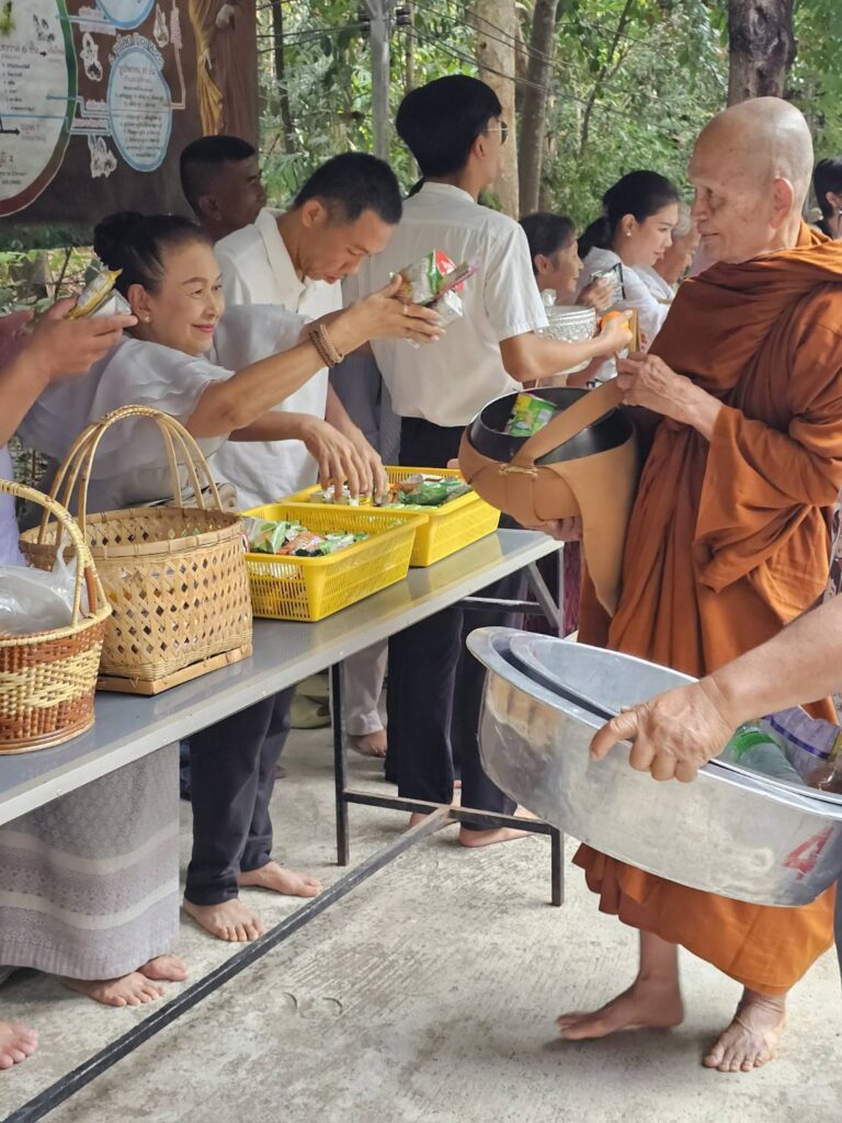 ช่วงเช้า เราใส่บาตรด้วยนม ขนม น้ำ ถวายภัตตาหารพระ เมนูมี ข้าวผัดกุ้งผัด ผักรวมมิตร ปลาสามรส หล่นเต้าเจี้ยว และผักเครื่องเคียง เห็ดกรอบจากฟาร์มมั่งมี ข้าวสวย น้ำดื่ม