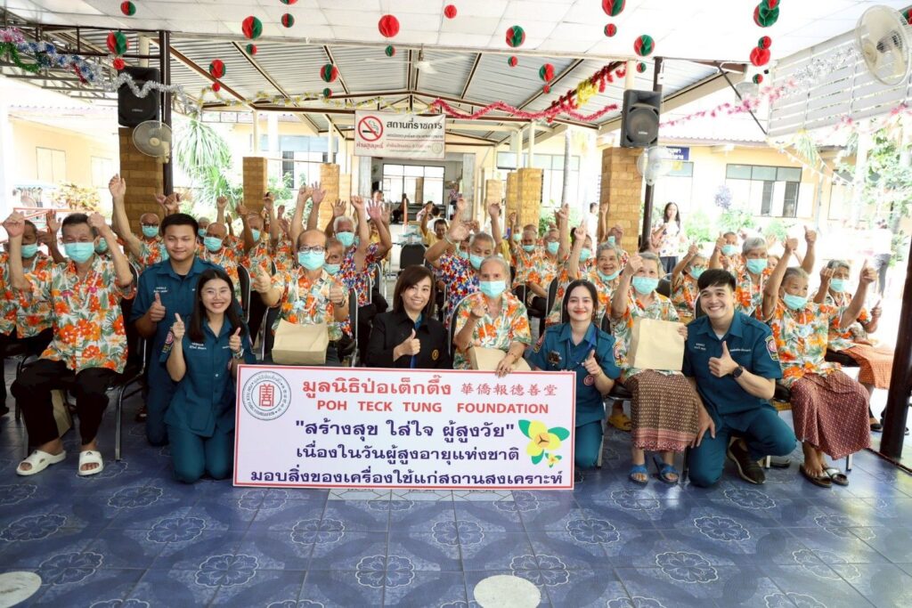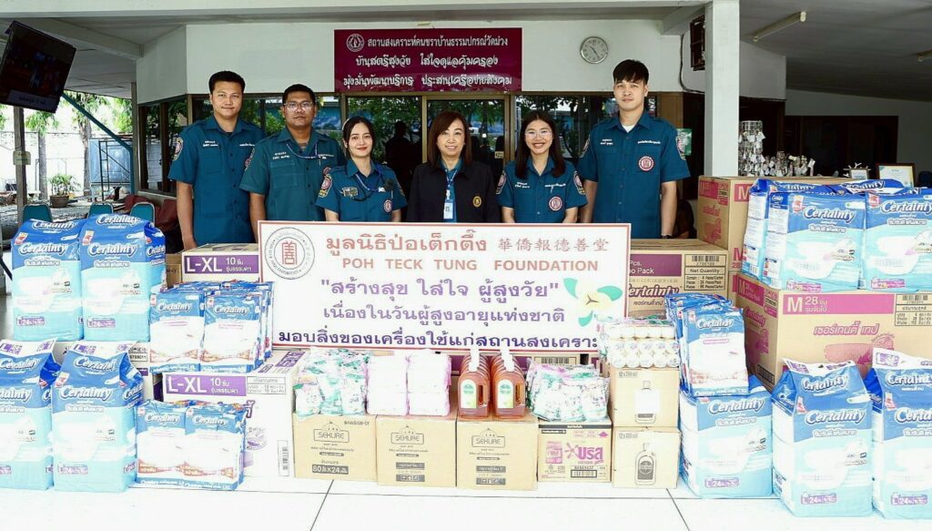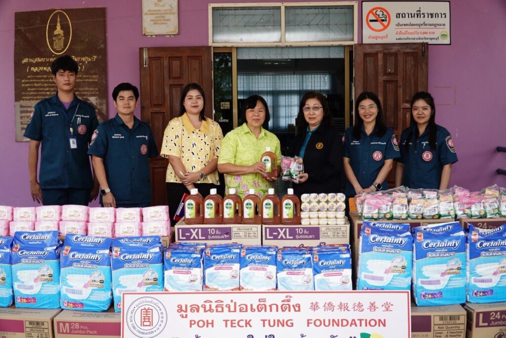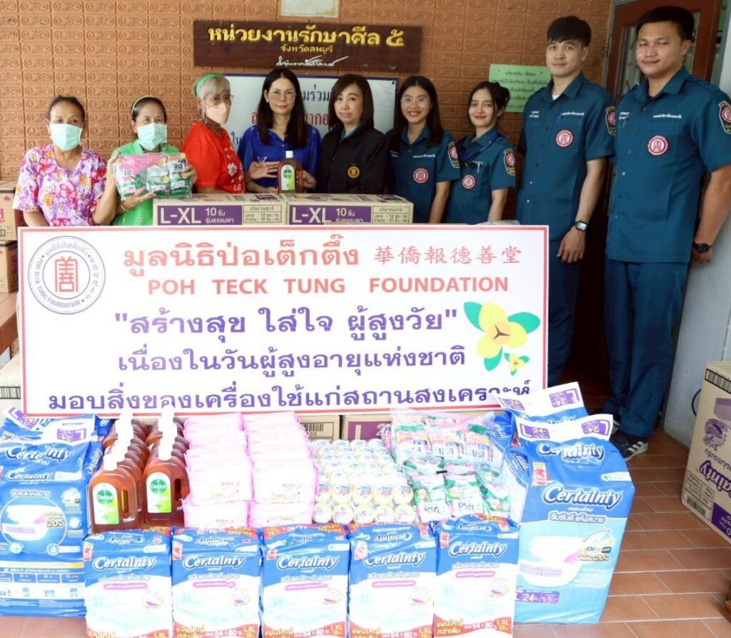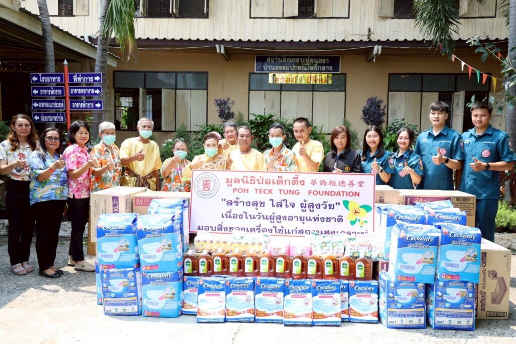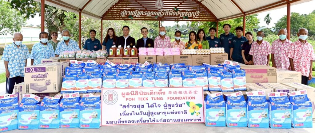 พร้อมกันนี้ มูลนิธิป่อเต็กตึ๊ง ยังได้ลงพื้นที่มอบสิ่งของเครื่องใช้จำเป็น ในโครงการ “ป่อเต็กตึ๊ง สร้างสุข ใส่ใจ ผู้สูงวัย” ประจำปี 2568 ประกอบด้วย ผ้าอ้อมสำเร็จรูป แผ่นรองซับ น้ำยาฆ่าเชื้อโรค ผงซักฟอก และปิโตรเลียม เจลลี่ (สำหรับผู้ป่วยติดเตียง) ให้แก่ผู้สูงวัยในสถานคุ้มครองคนไร้ที่พึ่งนนทบุรี จ.นนทบุรี ศูนย์พัฒนาการจัดสวัสดิการสังคมผู้สูงอายุปทุมธานี สถานคุ้มครองคนไร้ที่พึ่งชายธัญบุรี และสถานคุ้มครองคนไร้ที่พึ่งหญิงธัญบุรี จ.ปทุมธานี ศูนย์พัฒนาการจัดสวัสดิการสังคมผู้สูงอายุวาสนะเวศม์ จ.พระนครศรีอยุธยา สถานสงเคราะห์คนชราบ้านธรรมปกรณ์ (วัดม่วง) และสถานสงเคราะห์คนชราบ้านธรรมปกรณ์ (โพธิ์กลาง) จ.นครราชสีมา สถานสงเคราะห์คนชราเฉลิมราชกุมารี (หลวงพ่อลำใยอุปถัมภ์) จ.กาญจนบุรี และสถานสงเคราะห์คนชราเฉลิมราชกุมารี (หลวงพ่อเปิ่นอุปถัมภ์) จ.นครปฐม รวม 10 แห่ง รวมมูลค่าทั้งสิ้น 749,520 บาท (เจ็ดแสนสี่หมื่นเก้าพันห้าร้อยยี่สิบบาทถ้วน) เพื่อเป็นขวัญและกำลังใจแก่ผู้สูงอายุ เนื่องในวันผู้สูงอายุแห่งชาติ ประจำปี 2568
