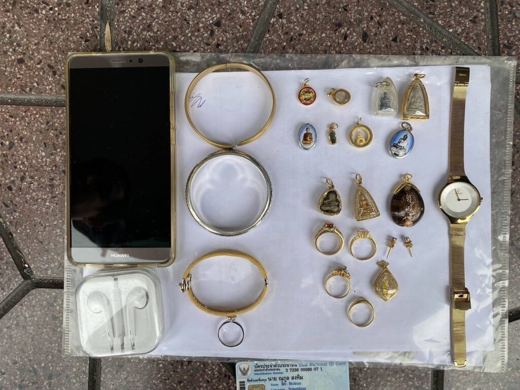 - นาฬิกาข้อมือ สีทอง จำนวน 1 เส้น 8.หูฟัง จำนวน 1 เส้น 9.พระเครื่องประเภทต่างๆ จำนวน 11 องค์ .10. ตุ้มหูทองคำฝังเพชร จำนวน 1 คู่ 11 แหวนทองคำฝังเพชร จำนวน 3 วง 12 แหวนเงินฝังเพชร จำนวน 1 วง 13.กระเป๋าสะพายลายแถบคาด สีขาว-ดำ จำนวน 1 ใบ 14 เสื้อคลุมแขนยาวสีขาว มีลายแถบคาดสีน้ำเงิน จำนวน 1 ตัว