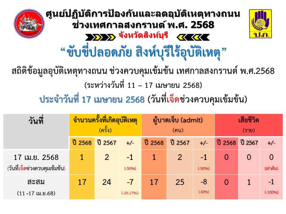 ในช่วงเทศกาลสงกรานต์ สรุป 7 วัน(11-17 เม.ย.68) จังหวัดสิงห์บุรี เกิดเหตุจำนวน 17 ครั้ง บาดเจ็บ 17 ราย ไม่มีผู้เสียชีวิต จำนวนครั้ง จำนวนผู้บาดเจ็บ และเสียชีวิต ลดลงจากปีที่ผ่านมา ส่วนใหญ่จะเกิดในถนนสายรองในหมู่บ้านและชุมชน โดยรถจักรยานยนต์ เกิดอุบัติเหตุสูงสุด สาเหตุ ไม่สวมหมวกกันน็อค และดื่มแล้วขับ เป็นการเดินทางภายในจังหวัด สาเหตุการเกิดอุบัติเหตุในครั้งนี้ จังหวัดสิงห์บุรีจะใช้เป็นแนวทางการในการกำหนดมาตรการการป้องกันและลดอุบัติเหตุในช่วงเทศกาลสงกรานต์ในปี 2569 ต่อไป