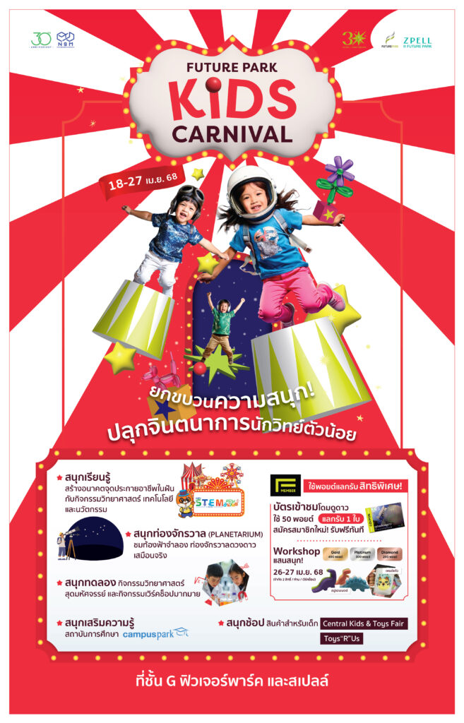ปิดเทอมนี้อย่าพลาด มาสนุกพร้อมเรียนรู้ เสริมทักษะและจินตนาการไปกับ “FUTURE PARK KIDS CANIVAL” ที่ศูนย์การค้าฟิวเจอร์พาร์คและสเปลล์ แล้วเปลี่ยนวันว่างธรรมดาให้กลายเป็นช่วงเวลาที่น่าจดจำสำหรับเด็กๆ ทุกคน.