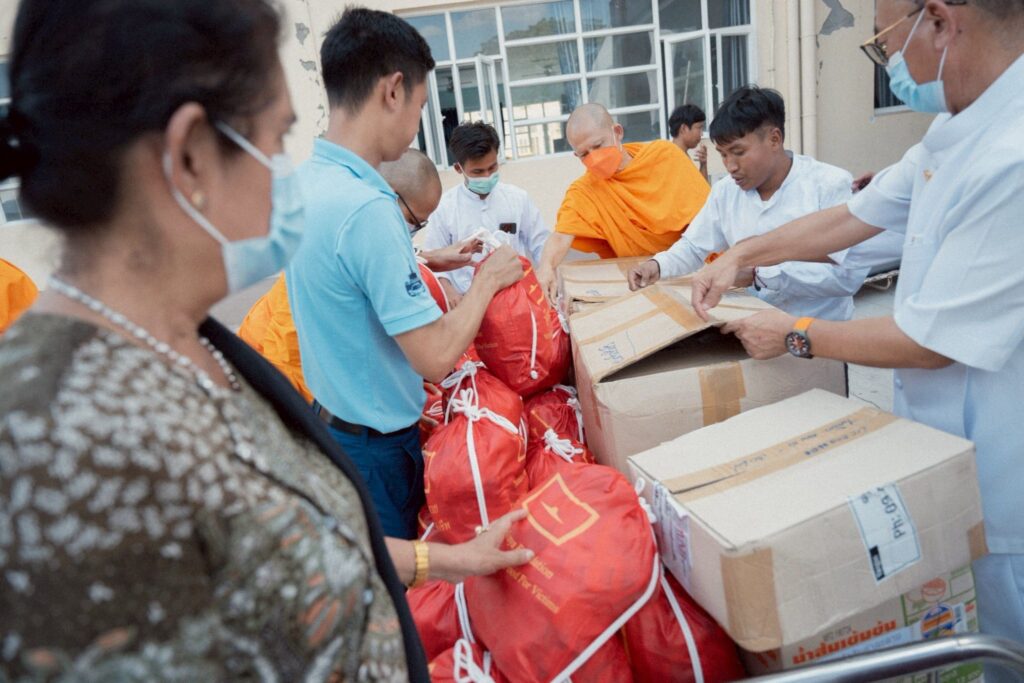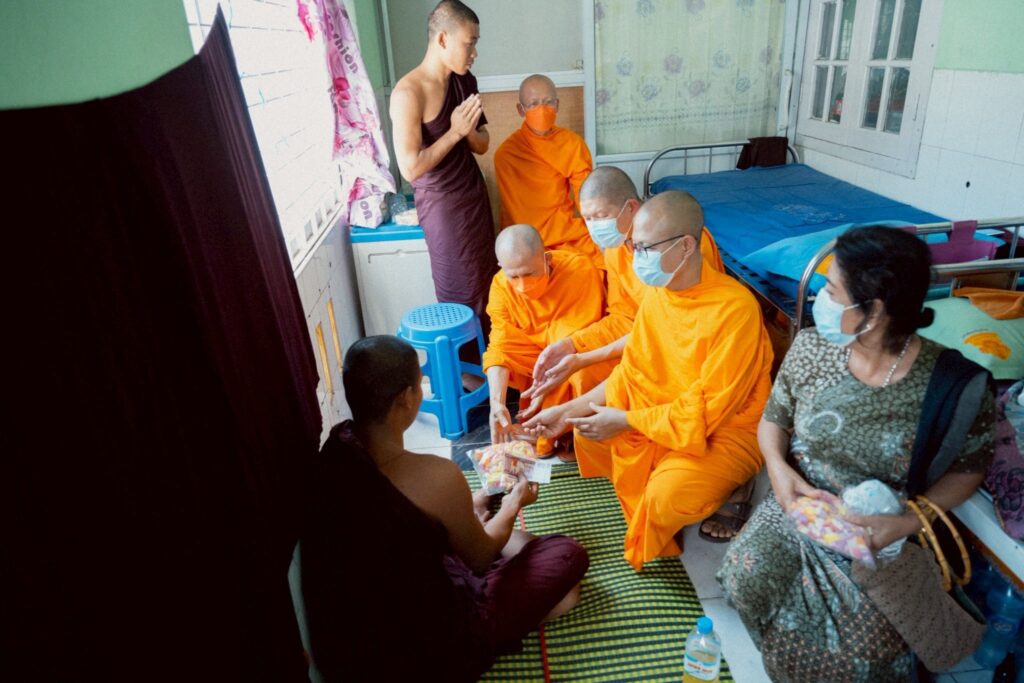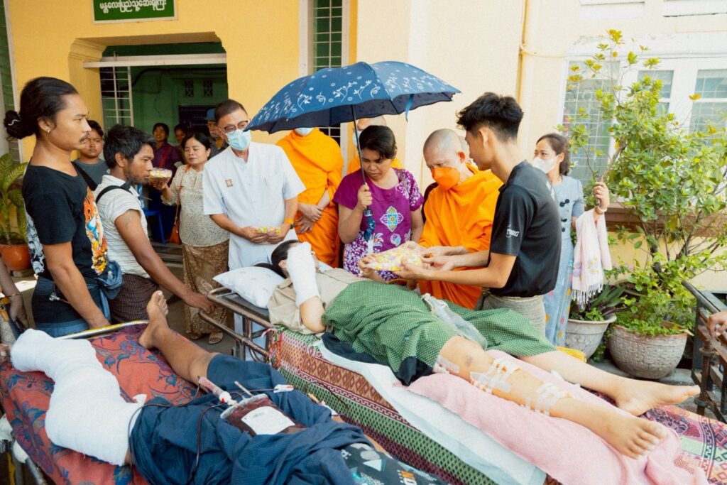 จากนั้นเดินทางไปถวายกัปปิยภัณฑ์จำนวน 40,000 บาท พร้อมด้วยสิ่งของจำเป็นประกอบด้วย บะหมี่กึ่งสำเร็จรูป 2 ลัง เครื่องดื่มชง 2 ลัง ข้าวสวยกระป๋อง 4 ลัง ขนมปี๊บ 1 ลัง วิตามินรวม 5 ลัง มุ้งใหญ่ 1 หลัง ผ้ากันน้ำ 1 ชุดผ้าห่ม 20 ผืน แด่ อูธัมมะธิปัจตราลินการะ เจ้าอาวาสวัดโมกาว ซึ่งเป็นวัดเก่าแก่มีอายุกว่าร้อยปี ซึ่งได้รับความเสียหายอย่างหนัก และอูวิเซะตาภิวังสะ เจ้าอาวาสวัดมะโซเยไต๊เฮา ที่พระภิกษุสามเณรกำลังประสบปัญหาอาคารที่พักอาศัยส่วนใหญ่เกิดความเสียหายใช้การไม่ได้ ตลอดจนได้สวดพระอภิธรรมอุทิศส่วนกุศลในจุดที่พบร่างผู้เสียชีวิตใต้ซากอาคาร ต่อมาเดินทางไปถวายกับปิยภัณฑ์จำนวน 40,000 บาท แด่เจ้าอาวาสวัดเจ้าไทและวัดเมี๊ยเจ้าเพื่อสมทบทุนซ่อมแซมวัดวาอารามที่เสียหาย และร่วมบุญในการจัดทำภัตตาหารปรุงสุกเพื่อมอบแด่ประชาชนวันละ 500 กล่อง