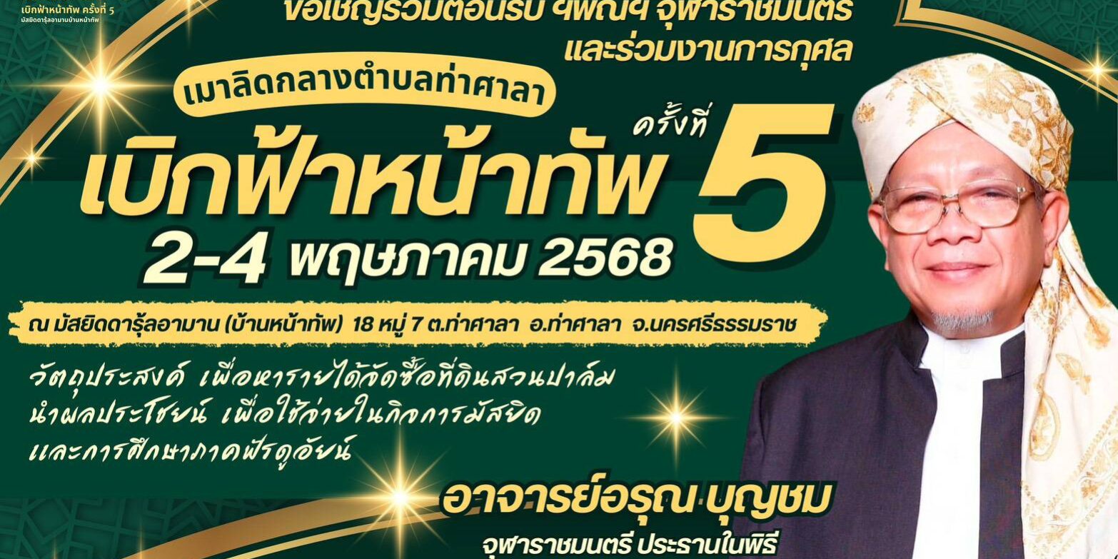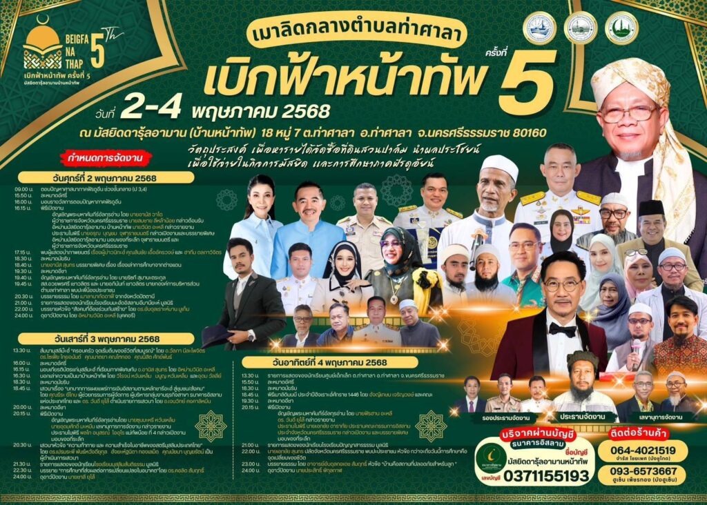 คณะกรรมการมัสยิดดารุ้ลอามาน บ้านหน้าทัพ ร่วมกับภาคีเครือข่ายภาครัฐ ภาคประชาชน และองค์กรศาสนา กำหนดจัดงาน “เมาลิดกลางตำบลท่าศาลา เบิกฟ้าหน้าทัพ ครั้งที่ 5” ขึ้นในระหว่างวันที่ 2 – 4 พฤษภาคม 2568 ณ มัสยิดดารุ้ลอามาน บ้านหน้าทัพ ตำบลท่าศาลา อำเภอท่าศาลา จังหวัดนครศรีธรรมราช
