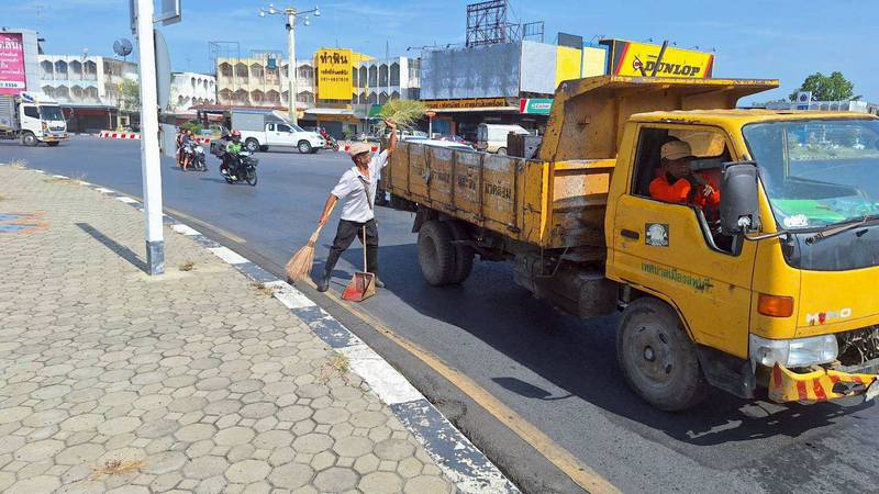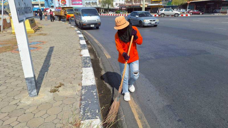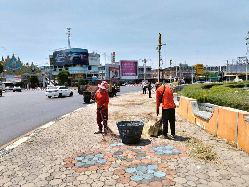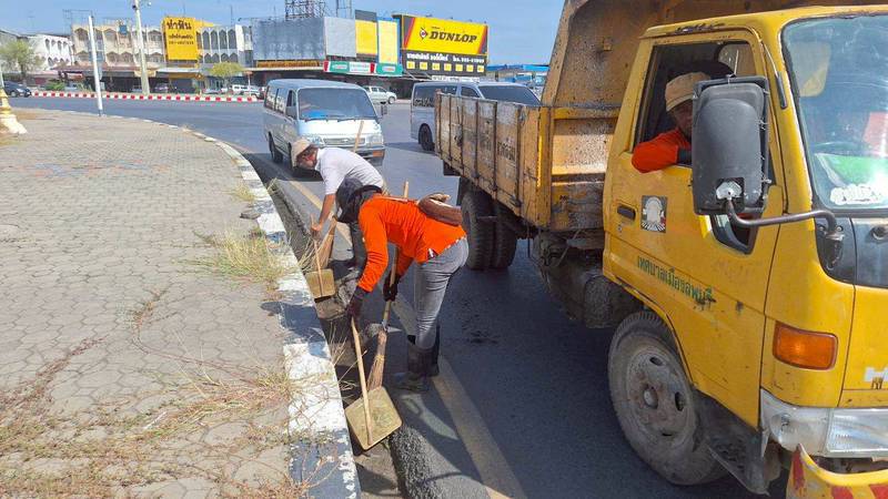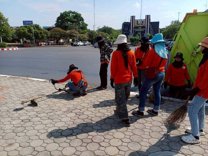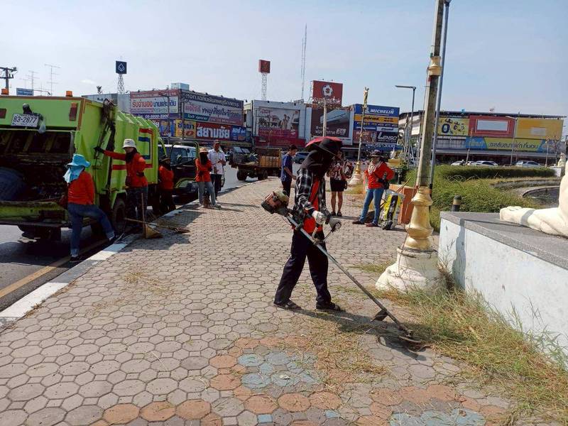 เก็บกวาดทำความสะอาดฟุตบาททางเท้าบริเวณรอบวงเวียนศรีสุริโยทัย (วงเวียนสระแก้ว) พร้อมขุดเซาะร่องรางระบายน้ำ เพื่อให้เกิดความสะอาด สวยงาม เป็นระเบียบเรียบร้อยของบ้านเมือง