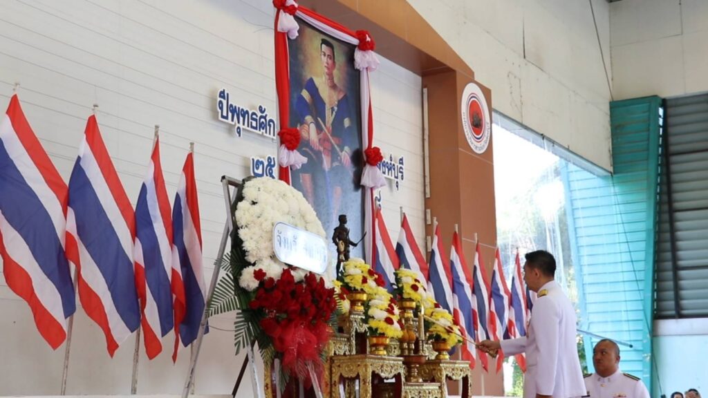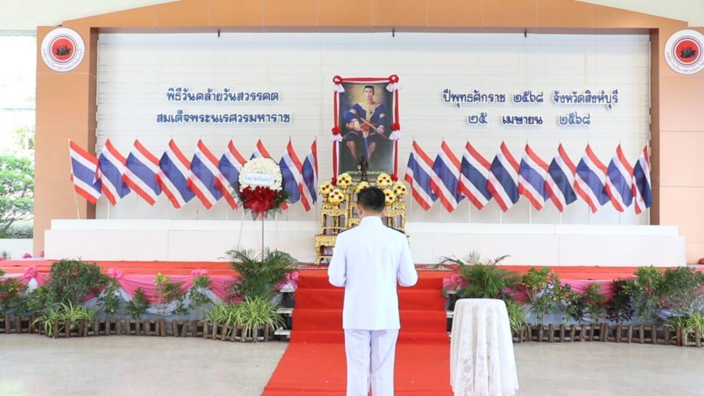 วันนี้ 25 เม.ย. 68 เวลา 08.30 น. ณ อาคารเอนกประสงค์สนามกีฬาจังหวัดสิงห์บุรี นายสุเมธ ธีรนิติผู้ว่าราชการจังหวัดสิงห์บุรีเป็นประธานในพิธีวันคล้ายวันสวรรคตสมเด็จพระนเรศวรมหาราช วางพวงมาลาถวายราชสักการะ และกล่าวถวายราชสดุดี ต่อเบื้องหน้าพระบรมสาทิสลักษณ์ สมเด็จพระนเรศวรมหาราช เนื่องในวันคล้ายวันสวรรคต โดยมี นายวราดิศร อ่อนนุช รองผู้ว่ารชาการจังหวัดสิงห์บุรี หัวหน้าส่วนราชการ ศาล ทหาร ตำรวจ เหล่ากาชาดจังหวัดสิงห์บุรี แม่บ้านมหาดไทยจังหวัดสิงห์บุรี หน่วยงานภาครัฐ ทุกภาคส่วนเข้าร่วมพิธี เพื่อเป็นการน้อมรำลึกถึงพระเกียรติคุณพระองค์ท่านที่ทรงปรีชาสามารถ กล้าหาญ เด็ดเดี่ยว ทรงเป็นวีรกษัตริย์ที่ทรงพระปรีชาสามารถอย่างล้ำเลิศ ทรงสร้างความเป็นเอกราชให้แก่ชาติไทย