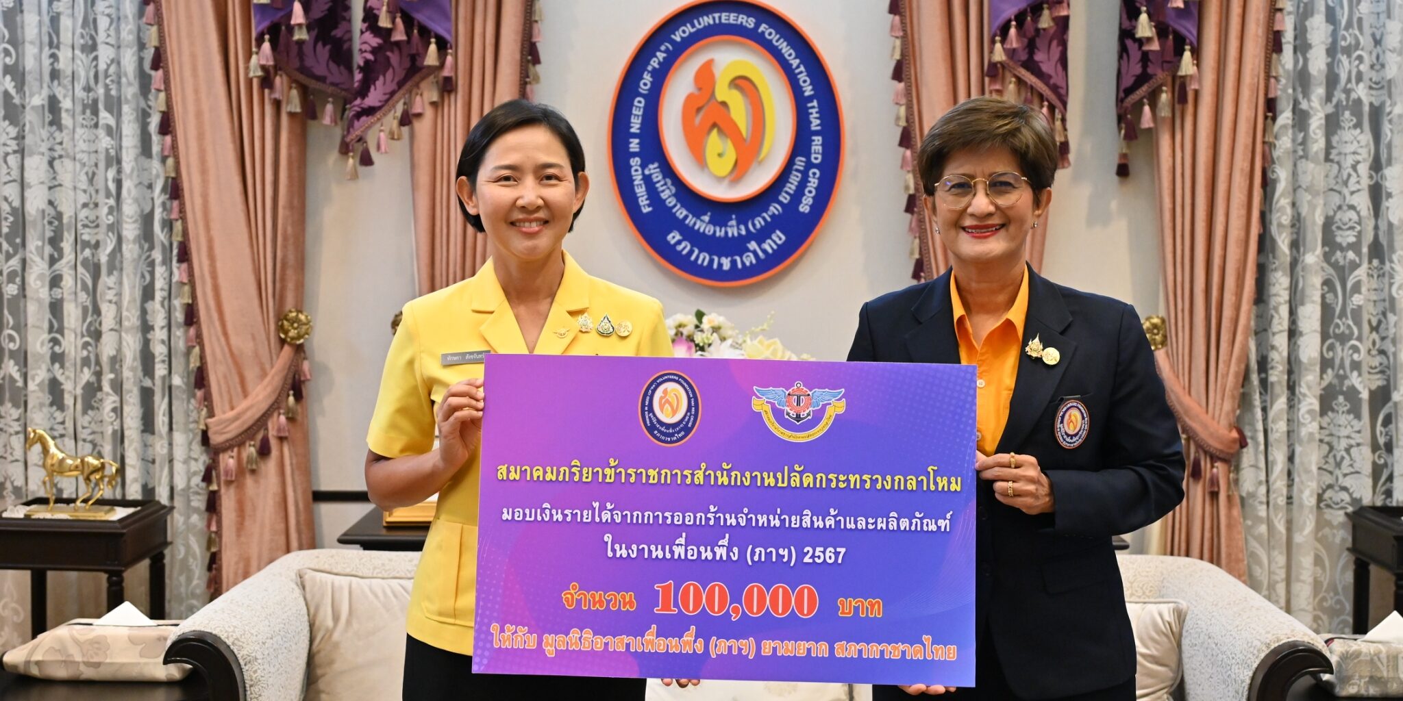 วันนี้(25 เมษายน 2568) พลตรีหญิง ทักษดา สังขจันทร์ นายกสมาคมภริยาข้าราชการสำนักงานปลัดกระทรวงกลาโหม พร้อมคณะ เข้ามอบเงินจากการออกร้านในงานเพื่อนพึ่ง (ภาฯ) 2567 จำนวน 100,000 บาท เพื่อสมทบทุนมูลนิธิอาสาเพื่อนพึ่ง (ภาฯ) ยามยาก สภากาชาดไทย ในการช่วยเหลือผู้ประสบอุทกภัย โดยมี คุณนฤมล ล้อมทอง กรรมการมูลนิธิฯ เป็นผู้รับมอบ ณ อาคารมหินทรเดชานุวัตน์ มูลนิธิอาสาเพื่อนพึ่ง (ภาฯ) ยามยาก สภากาชาดไทย