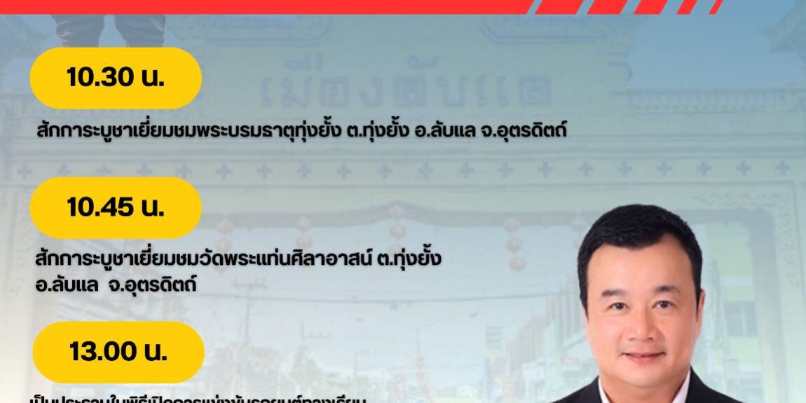 13.00 น. เป็นประธานในพิธีเปิดการแข่งขันรถยนต์ทางเรียบ UTTARADIT RACING CAR THAILAND FESTIVAL 2025 ณ อนุสาวรีย์พระยาพิชัยดาบหัก อ.เมืองอุตรดิตถ์ จ.อุตรดิตถ์