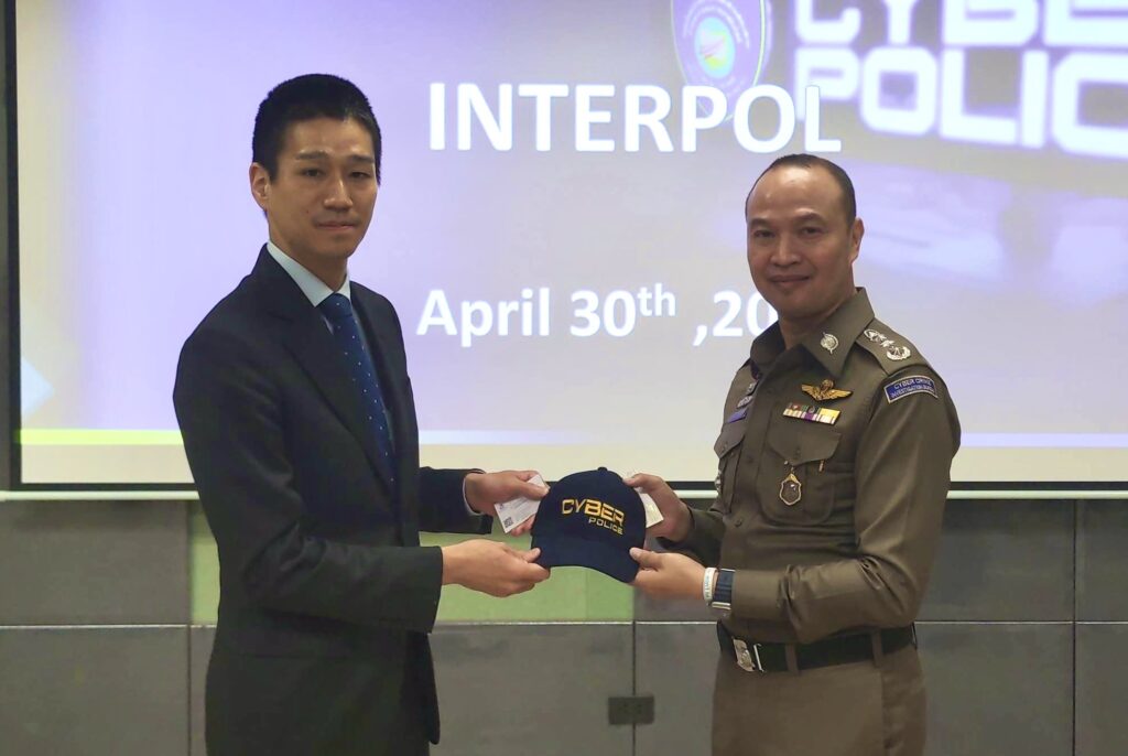 จากนั้นพล.ต.ท.ไตรรงค์ ผิวพรรณ ผบช.สอท. ได้มอบหมวก Cyber police และเข็มที่ระลึก ให้กับทั่ง 2 ท่านด้วย