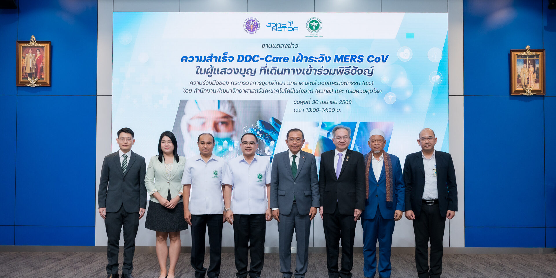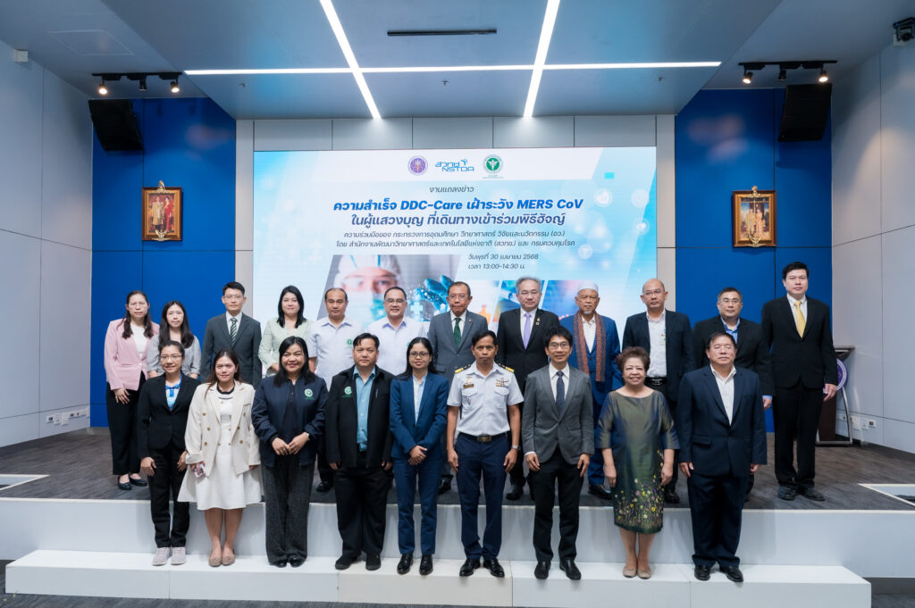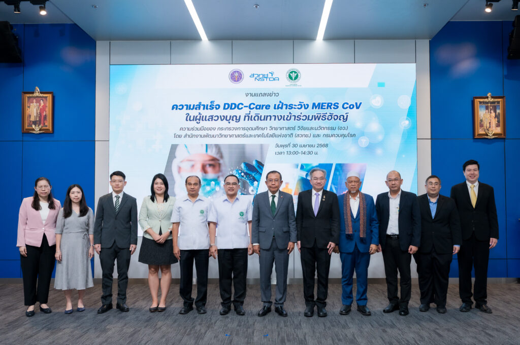 วันที่ 30 เมษายน 2568 ที่ห้องแถลงข่าวชั้น 1 กระทรวง อว. อาคารพระจอมเกล้า : นายศุภชัย ใจสมุทร ผู้ช่วยรัฐมนตรีประจำกระทรวงการอุดมศึกษา วิทยาศาสตร์ วิจัยและนวัตกรรม (อว.) เป็นประธานแถลงข่าว ความสำเร็จ DDC-Care เฝ้าระวังโรคเมอร์ส (MERS-CoV) ในผู้แสวงบุญที่เดินทางเข้าร่วมพิธีฮัจญ์ จากความร่วมมือของกระทรวงการอุดมศึกษา วิทยาศาสตร์ วิจัยและนวัตกรรม (อว.) โดย สำนักงานพัฒนาวิทยาศาสตร์และเทคโนโลยีแห่งชาติ (สวทช.) และกรมควบคุมโรค กระทรวงสาธารณสุข เพื่อดำเนินมาตรการเฝ้าระวังโรคทางเดินหายใจตะวันออกกลาง หรือโรคเมอร์ส MERS-CoV อย่างเข้มงวด ด้วย DDC-Care Platform เทคโนโลยีรับมือโรคระบาดข้ามพรมแดน ซึ่งถือเป็นการทำงานเชิงรุกและการเฝ้าระวังโรคตามมาตรการสาธารณสุข สำหรับผู้แสวงบุญชาวไทยที่เดินทางเข้าร่วมพิธีฮัจญ์ โดยมี ศาสตราจารย์ ดร.ชูกิจ ลิมปิจำนงค์ ผู้อำนวยการ สวทช. นายแพทย์ดิเรก ขำแป้น รองอธิบดีกรมควบคุมโรค กระทรวงสาธารณสุข นายประสิทธิ์ มะหะหมัด เลขานุการจุฬาราชมนตรี ทีมนักวิจัยและเจ้าหน้าที่ของหน่วยงานที่เกี่ยวข้องเข้าร่วมแถลงข่าว