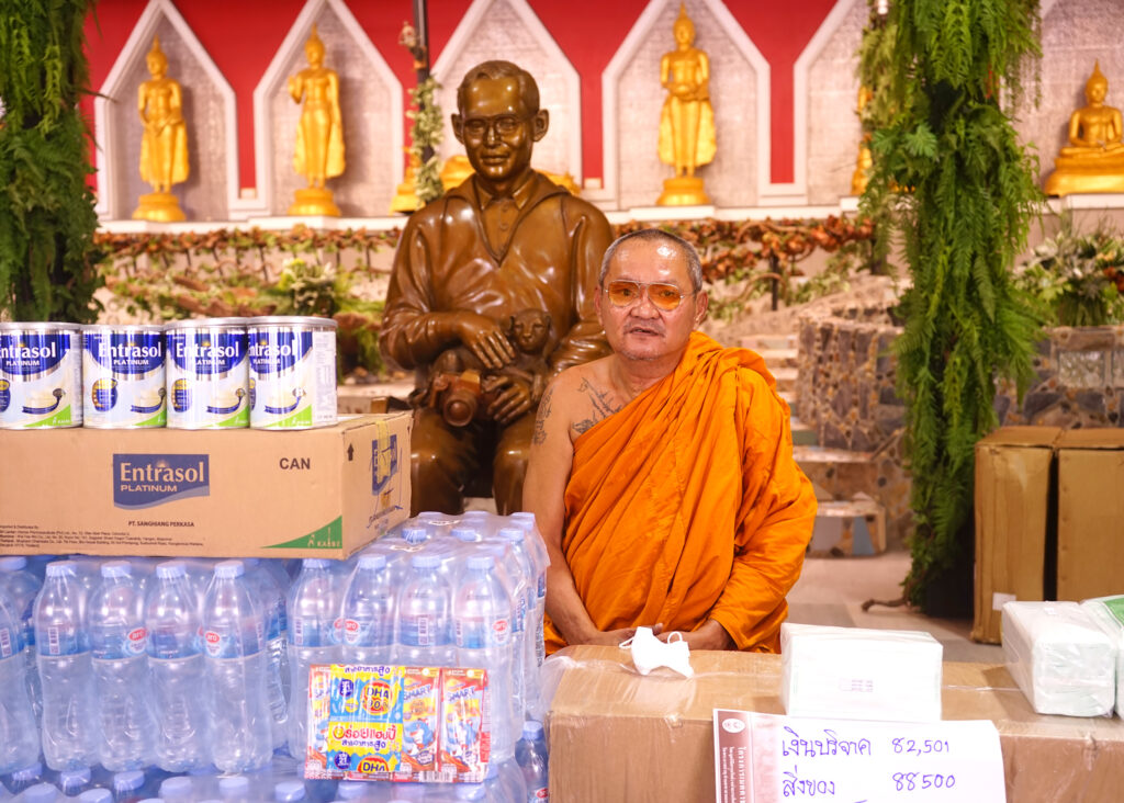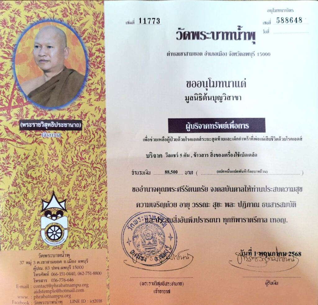 สิ่งของที่นำไปมอบในครั้งนี้ ประกอบด้วย รถวีลแชร์ 5 คัน,ข้าวสารอาหารแห้ง น้ำดื่ม, แพมเพิสผู้ใหญ่ สิ่งของเครื่องใช้เบ็ดเตล็ด รวมถึงยอดเงินบริจาค 88,500 บาท เพื่อใช้ในการดำเนินงานของวัดพระบาทน้ำพุ ซึ่งปัจจุบันมีผู้ป่วยและเด็กกำพร้าอยู่ในความดูแลกว่า 2,000 คน