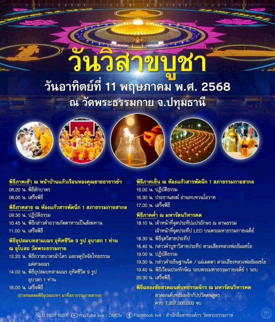 วันที่ 9 พฤษภาคม 2568 เนื่องในวันวิสาขบูชาโลก วัดพระธรรมกาย จังหวัดปทุมธานี ได้จัดกิจกรรมเฉลิมฉลองวันสำคัญทางพระพุทธศาสนาอย่างยิ่งใหญ่ ซึ่งปีนี้ตรงกับวันอาทิตย์ที่ 11 พฤษภาคม โดยมีพุทธศาสนิกชนจากทั่วโลกพร้อมใจร่วม จุดวิสาขประทีป ถวายเป็นพุทธบูชา และร่วมกันสวด ธรรมจักรกัปปวัตตนสูตร ครบกว่า 7,357,000,000 จบ แสดงพลังศรัทธาอันยิ่งใหญ่ต่อพระธรรมคำสอนของพระสัมมาสัมพุทธเจ้า