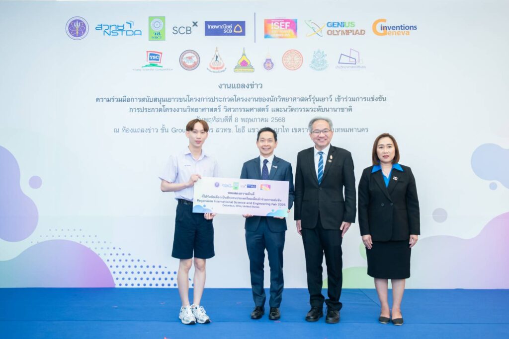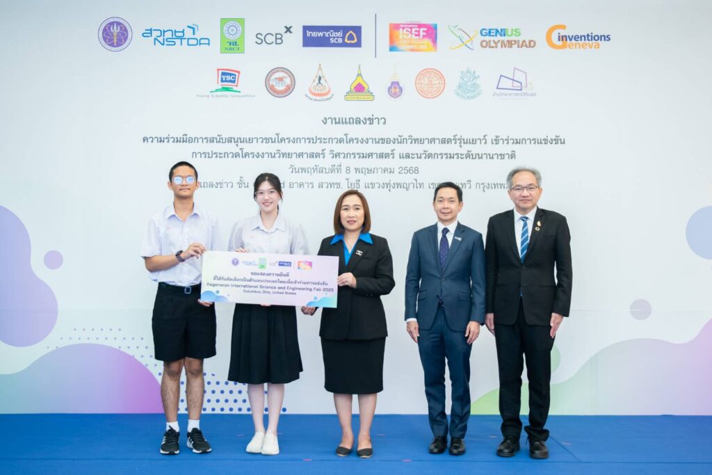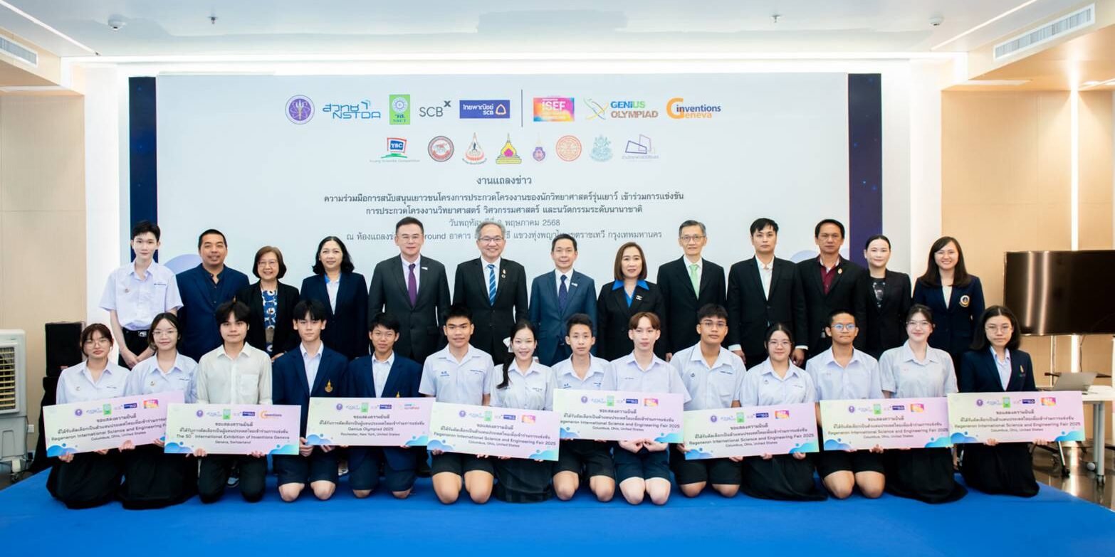 วันที่ 8 พฤษภาคม 2568 ณ ห้องแถลงข่าว ชั้น 1 สำนักงานพัฒนาวิทยาศาสตร์และเทคโนโลยีแห่งชาติ อาคาร (สวทช.) ซอยโยธี ถนนพระราม 6 แขวงทุ่งพญาไท เขตราชเทวี กรุงเทพฯ : สำนักงานพัฒนาวิทยาศาสตร์และเทคโนโลยีแห่งชาติ (สวทช.) ร่วมกับ สำนักงานการวิจัยแห่งชาติ (วช.) และ ธนาคารไทยพาณิชย์ จำกัด (มหาชน) (SCB) แถลงข่าวความร่วมมือในการสนับสนุนเยาวชนไทยภายใต้โครงการ การประกวดโครงงานของนักวิทยาศาสตร์รุ่นเยาว์ (Young Scientist Competition : YSC) ให้มีโอกาสเข้าร่วมแสดงศักยภาพในเวทีการแข่งขันและประกวดโครงงานวิทยาศาสตร์และวิศวกรรมระดับนานาชาติชั้นนำ 3 เวที ได้แก่ Regeneron International Science and Engineering Fair 2025 (Regeneron ISEF 2025), Genius Olympiad 2025 และ The 50th International Exhibition of Inventions Geneva โดยธนาคารไทยพาณิชย์ได้ให้การสนับสนุนโครงการนี้ต่อเนื่องเป็นปีที่ 5 ความร่วมมือนี้ตอกย้ำความมุ่งมั่นในการเปิดโอกาสและเสริมสร้างศักยภาพให้เยาวชนไทยให้ก้าวสู่เวทีการแข่งขันด้านวิทยาศาสตร์ เทคโนโลยี และนวัตกรรม (วทน.) ระดับโลกเตรียมความพร้อมสู่การเป็นบุคลากรคุณภาพสูงและเป็นกำลังสำคัญของประเทศในอนาคต