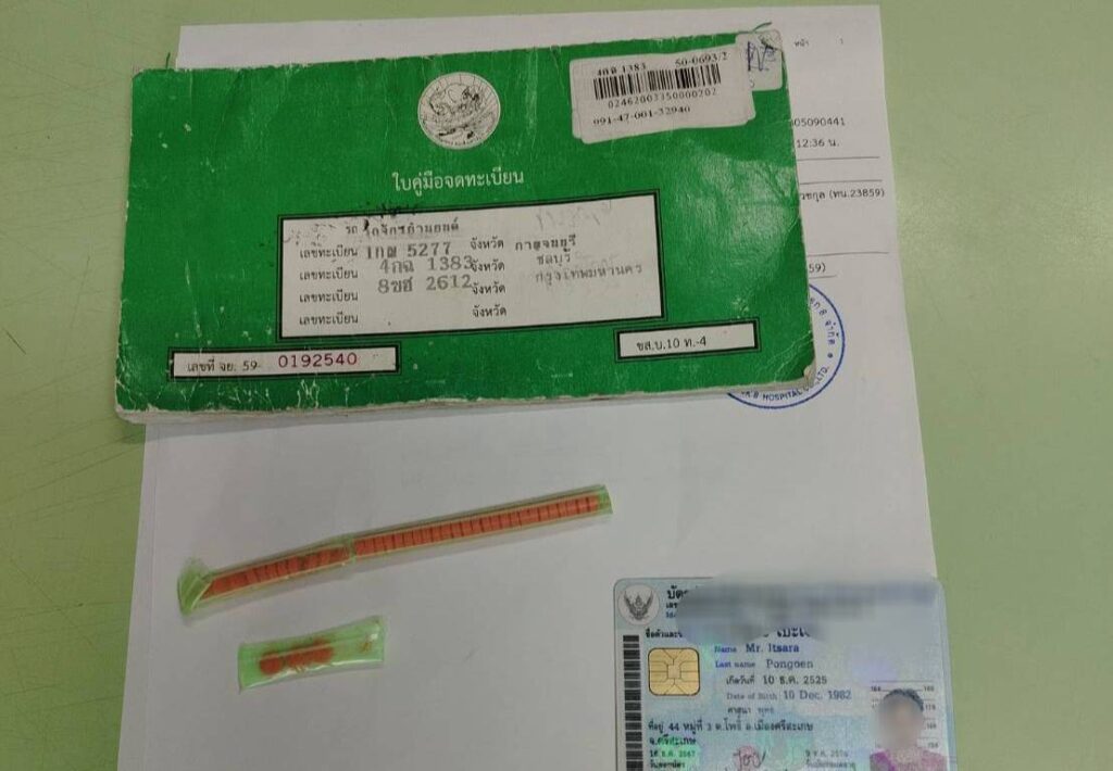 3 ใบรับรองตรวจสอบสารเสพติดในร่างกาย โรงพยาบาลบางปะกอก 8 , 1 ฉบับ จับกุมได้ บริเวณแยกวัดสิงห์ ถนนเอกชัย