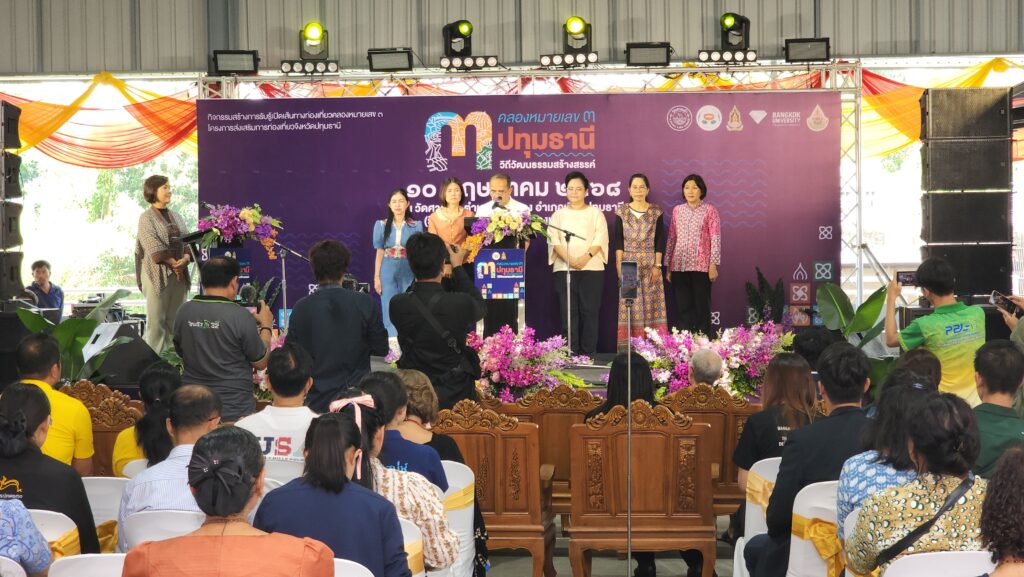ด้าน นางลัษมา ธารีเกษ วัฒนธรรมจังหวัดปทุมธานีกล่าวว่า จังหวัดปทุมธานี ได้มอบหมายให้ สำนักงานวัฒนธรรมจังหวัดปทุมธานี จัดโครงการส่งเสริมการท่องเที่ยวชุมชนคลองหมายเลข 3โดยมีวัตถุประสงค์เพื่อพัฒนาต่อยอดทุนทางวัฒนธรรมให้เป็นสินค้าและบริการทางวัฒนธรรมที่น่าสนใจสามารถจำหน่ายสร้างรายได้ให้แก่ประชาชนในชุมชน และเพื่อพัฒนาศักยภาพชุมชนให้สามารถรองรับการท่องเที่ยวอย่างยั่งยืน โดยฟื้นฟู สืบสาน ส่งเสริมประเพณี วัฒนธรรม วิถีชีวิต การปรับปรุงแหล่งเรียนรู้แหล่งท่องเที่ยวเชิงประวัติศาสตร์และเชิงวัฒนธรรมในพื้นที่ชุมชน วัด ศาสนสถานที่อยู่ในเส้นทางคลองหมายเลข 3 ส่งเสริมการมีส่วนร่วมของชุมชนและภาคส่วนต่างๆ ในการพัฒนาพื้นที่ให้มีศักยภาพในการจัดการท่องเที่ยวอย่างมีคุณภาพและยั่งยืน โดยมีกิจกรรมตามโครงการ ดังนี้ กิจกรรมเรียงร้อยเรื่องราว จัดทำข้อมูลด้านวัฒนธรรม และศักยภาพด้านการท่องเที่ยวของชุมชน ที่ตั้งอยู่ในเส้นทางคลองหมายเลข 3 ที่ได้ความร่วมมือ เสนอแนวคิดการจัดกิจกรรมตามโครงการร่วมกับ คณาจารย์ คณะนิเทศศาสตร์ มหาวิทยาลัยกรุงเทพ กิจกรรมพัฒนานักเล่าเรื่อง และการเป็นเจ้าบ้านที่ดี จัดการอบรมในวันที่ 28 – 29 เมษายน 2568 ณ พิพิธภัณฑ์การเกษตรเฉลิมพระเกียรติฯ มีผู้เข้าร่วมอบรมจำนวน 50 คน โดยมีผู้นำชุมชน ประชาชน และเยาวชนที่อยู่ในพื้นที่เส้นทางคลองหมายเลข 3 เข้าร่วมอบร กิจกรรมเชื่อมแหล่งแจ้งเส้นทาง โดยประชุมร่วมกับคณาจารย์ คณะนิเทศศาสตร์ และคณะ เศรษฐศาสตร์ มหาวิทยาลัยกรุงเทพ จัดทำเส้นทางท่องเที่ยววิถีชุมชนคลองหมายเลข 3 โดยมุ่งเน้นศักยภาพด้านการท่องเที่ยวของชุมชน และสะท้อนอัตลักษณ์วิถีชุมชนคลองหมายเลข 3กิจกรรมพัฒนาต่อยอดสินค้าภูมิปัญญาจากชุมชน จัดการอบรมในวันที่ 6 – 7 พฤษภาคม 2568 ณ พิพิธภัณฑ์การเกษตรเฉลิมพระเกียรติฯ มีผู้เข้าร่วมอบรมจำนวน 50 คน โดยมีผู้ประกอบการวิสาหกิจชุมชน ประชาชน และเยาวชน ที่อยู่ในพื้นที่เส้นทางคลองหมายเลข 3 เข้าร่วมอบรม กิจกรรมสร้างการรับรู้เปิดเส้นทางท่องเที่ยวคลองหมายเลข 3 ในวันนี้ ณ วัดศาลเจ้า ตำบลบ้านกลาง อำเภอเมืองปทุมธานี