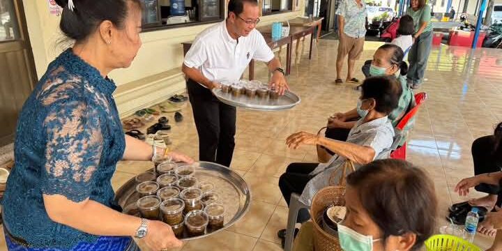 วัดหัวช้าง ต. ท่าศาลา อ. เมือง จ.ลพบุรี เสร็จพิธีสงฆ์ เดินเสิร์ฟข้าวทิพย์ให้กับผู้เฒ่าผู้แก่ และประชาชนที่ร่วมทำบุญในวันนี้ ยื่นมือรับยังไมตรี ยิ้มแย้มต้อนรับเหมือนครอบครัว