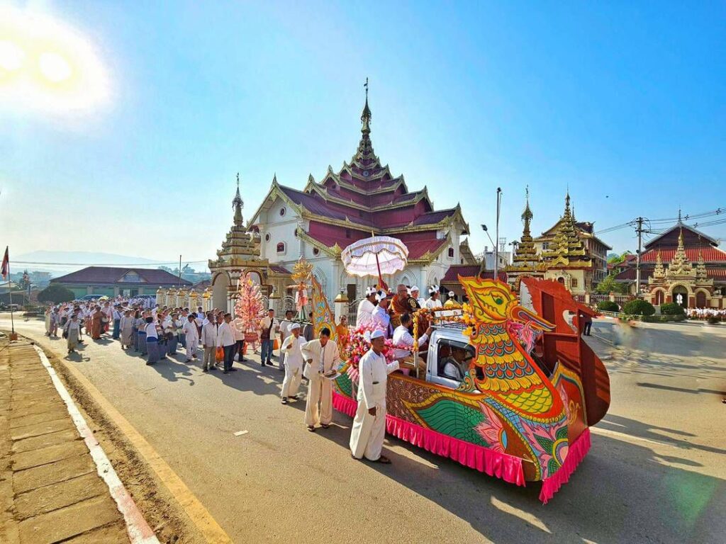 พิธีจัดขึ้น ณ วัดราชฐานหลวงเชียงยืน โดยคณะวัดพระธรรมกายร่วมขบวนแห่สมโภชรอบเมืองเชียงตุง และกล่าวถวายสาส์นจากคณะสงฆ์วัดพระธรรมกาย เพื่อแสดงมุทิตาสักการะสมเด็จอาชญาธรรมพระเจ้า พร้อมทั้งกล่าวคำถวายไทยธรรมโดยศิษยานุศิษย์ และร่วมพิธีถวายสังฆทานแก่พระสงฆ์ 101 วัด ซึ่งมีพุทธศาสนิกชนจากทั้งเชียงตุงและประเทศไทยเข้าร่วมอย่างเนืองแน่น ในโอกาสนี้ พระครูบาสาม โชติโก พระสังฆนายกเชียงตุง ได้กล่าวให้พรและนำพุทธศาสนิกชนกรวดน้ำรับพร ก่อนถ่ายภาพร่วมกันเป็นที่ระลึก