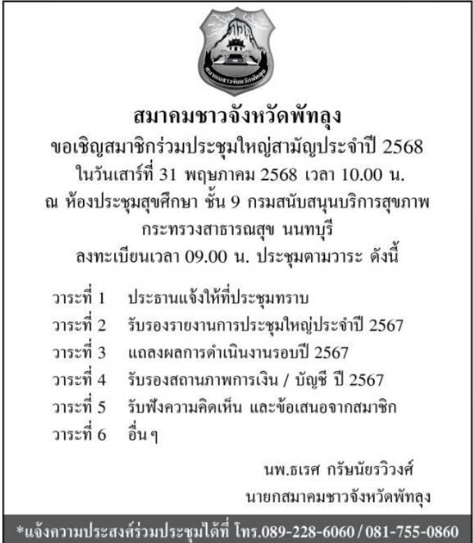 วันนี้ (16พ.ค.68) นายคณิต ชุมช่วย อุปนายก แจ้งข่าวประชาสัมพันธ์ เนื่องด้วย ใน วันเสาร์ ที่ 31 พฤษภาคม 2568 โดย สมาคมชาวจังหวัดพัทลุง ขอเชิญสมาชิกร่วมประชุมสามัญประจำปี 2568 ณ.ห้องประชุมสุขศึกษา ชั้น 9 กรมสนับสนุนบริการสุขภาพ กระทรวงสาธารณสุข นนทบุรี