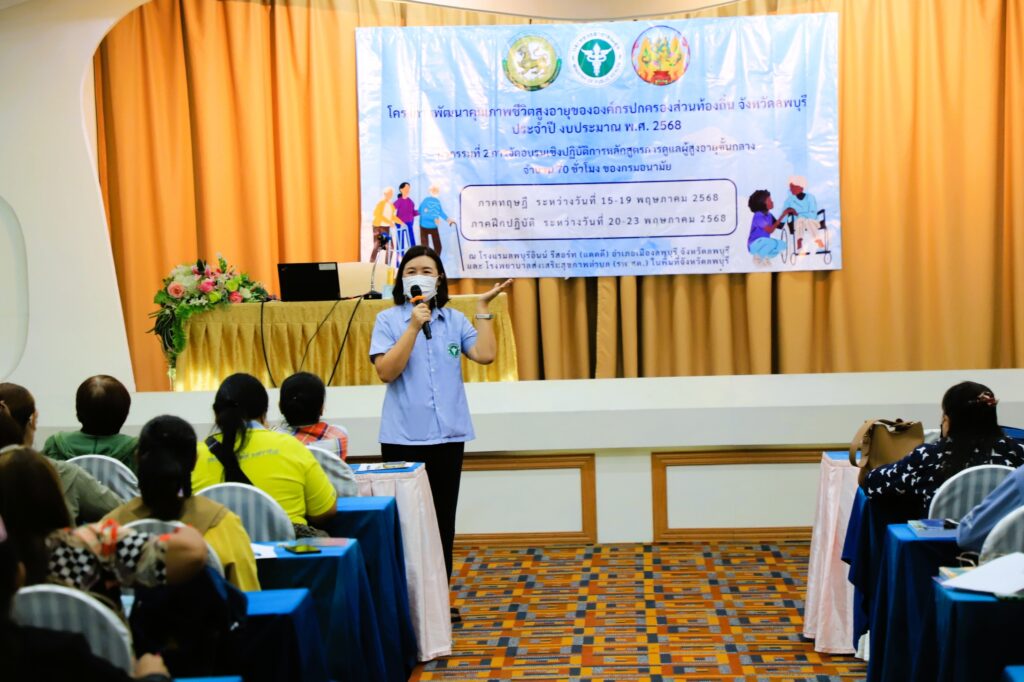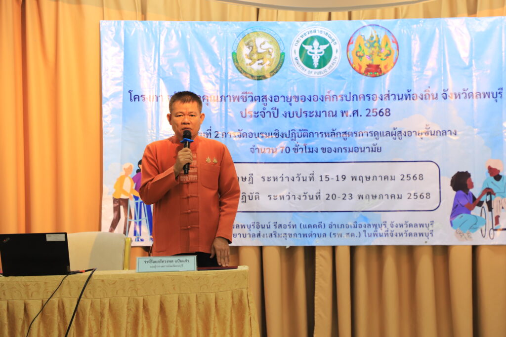 วันที่ 15 พฤษภาคม 2568 ณ โรงแรมลพบุรีอินน์ รีสอร์ท (แดดดี) อำเภอเมืองลพบุรี จังหวัดลพบุรี ว่าที่ร้อยตรี ทรงพล แป้นแก้ว รองผู้ว่าราชการจังหวัดลพบุรี เป็นประธานในพิธีเปิดโครงการพัฒนาคุณภาพชีวิตผู้สูงอายุขององค์กรปกครองส่วนท้องถิ่น จังหวัด ประจำปีงบประมาณ พ.ศ. 2568 ในกิจกรรมที่ 2 การจัดอบรมเชิงปฏิบัติการหลักสูตรการดูแลผู้สูงอายุขั้นกลาง จำนวน 70 ชั่วโมง ของกรมอนามัย โดยมี นางสาวศรุดา ชัยตันติกุล ท้องถิ่นจังหวัดลพบุรี พร้อมด้วย นางศศิธร ศรีแก้ว รองนายแพทย์สาธารณสุขจังหวัดลพบุรี ส่วนราชการ วิทยากร เจ้าหน้าที่ และ ผู้เข้าร่วมอบรมจากทั้ง 11 อำเภอ เข้าร่วม จำนวน 125 คน