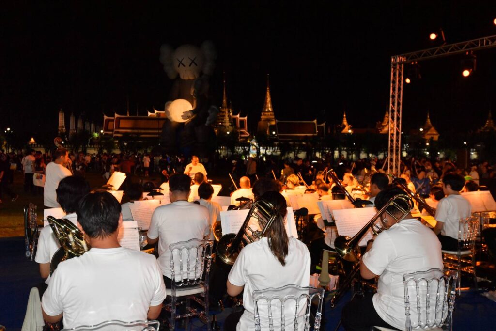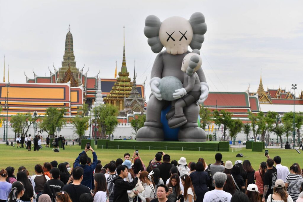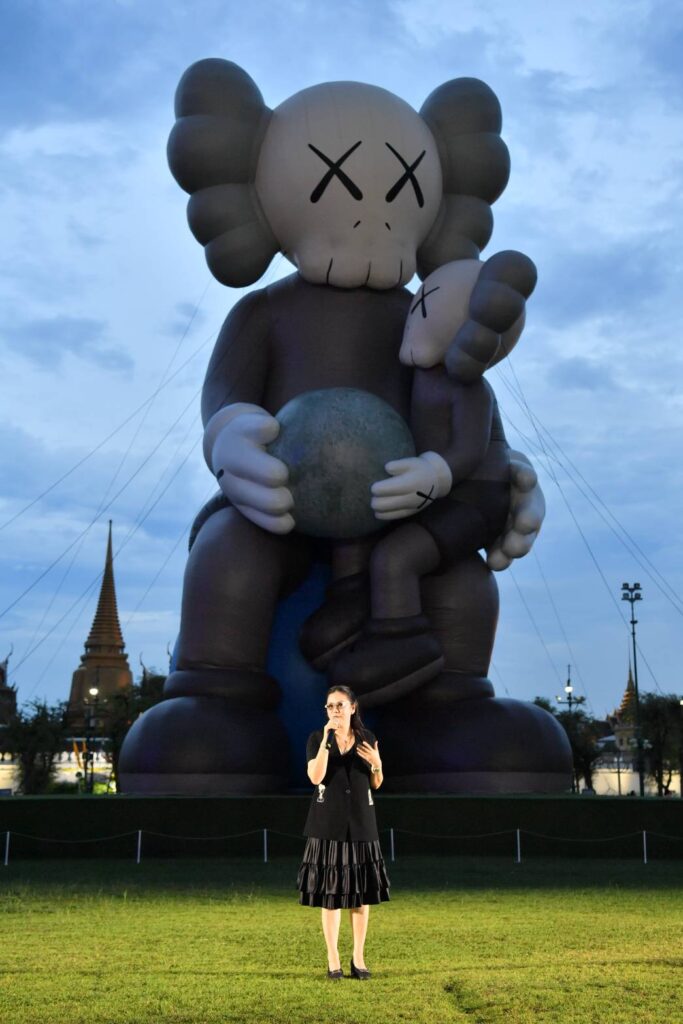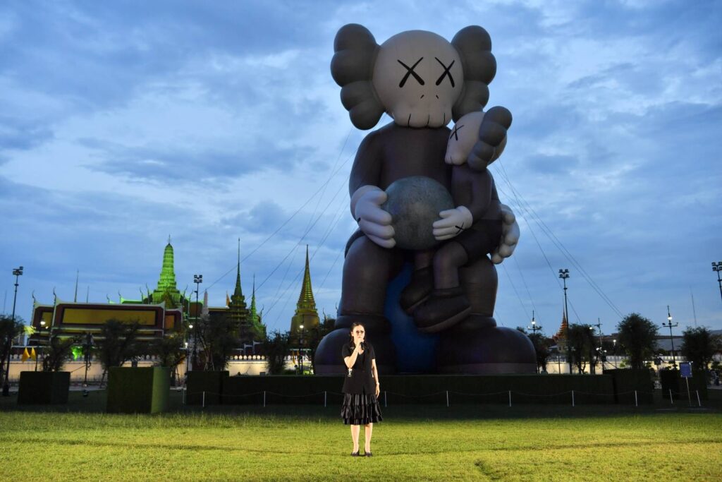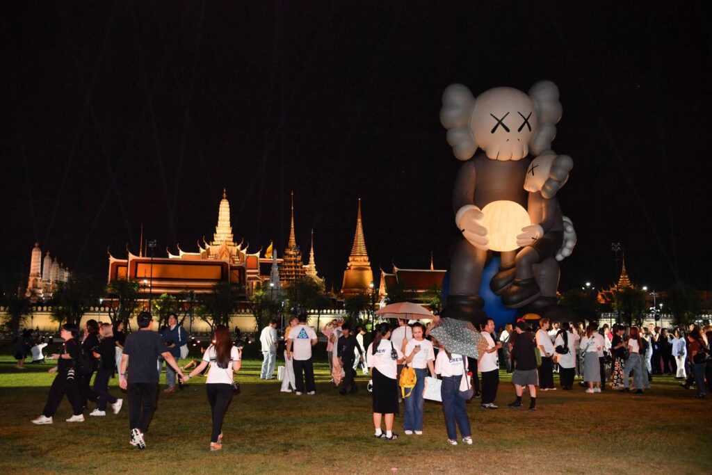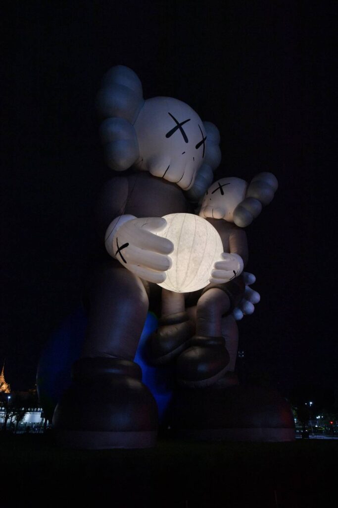 KAWS:HOLIDAY THAILAND คือศิลปะกลางแจ้งสุดยิ่งใหญ่ COMPANION สูงถึง 18 เมตร ตั้งตระหง่านอยู่ ณ สนามหลวง ใจกลางกรุงเทพฯ โอบอุ้มดวงจันทร์ไว้อย่างอ่อนโยน ขณะที่ COMPANION ตัวเล็กนั่งบนตักอย่างอบอุ่น สะท้อนสายสัมพันธ์ระหว่างรุ่น ถ่ายทอดคุณค่าและความใส่ใจจากอดีต ปัจจุบัน สู่อนาคต