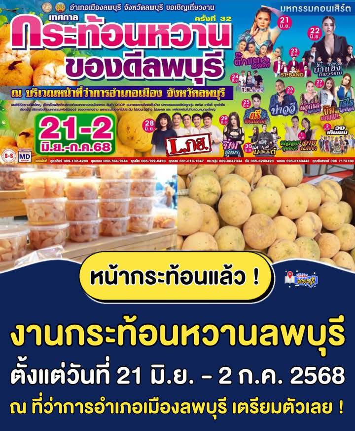 เดือนหน้าที่จะถึงนี้ใกล้ถึงงานประจำปีของอำเภอเมืองจังหวัดลพบุรีซึ่งเป็นงานส่งเสริม ท่องเที่ยวเชิงเกษตร ในงานกระท้อนหวานลพบุรีครั้งที่ 32 ประจำปี 2568 ปีนี้จัดยิ่งใหญ่กว่าทุกปีได้ขนนักร้องศิลปินชื่อดัง มาขึ้นเวทีและมีสินค้าออกบูธมากมายและมีผลผลิตกระท้อนมาจำหน่ายในงานนี้อีกด้วย