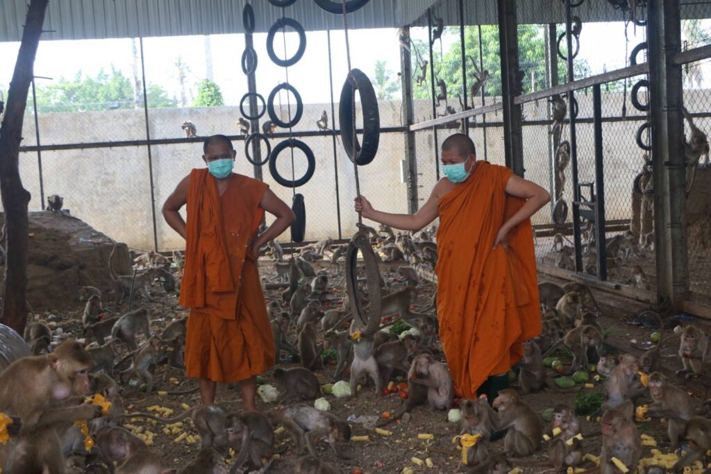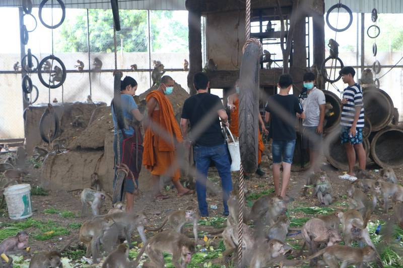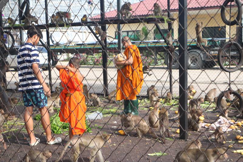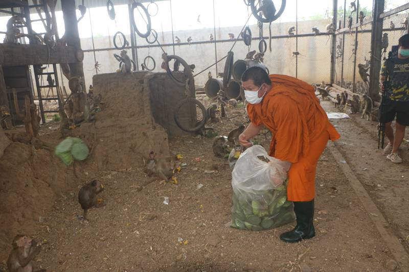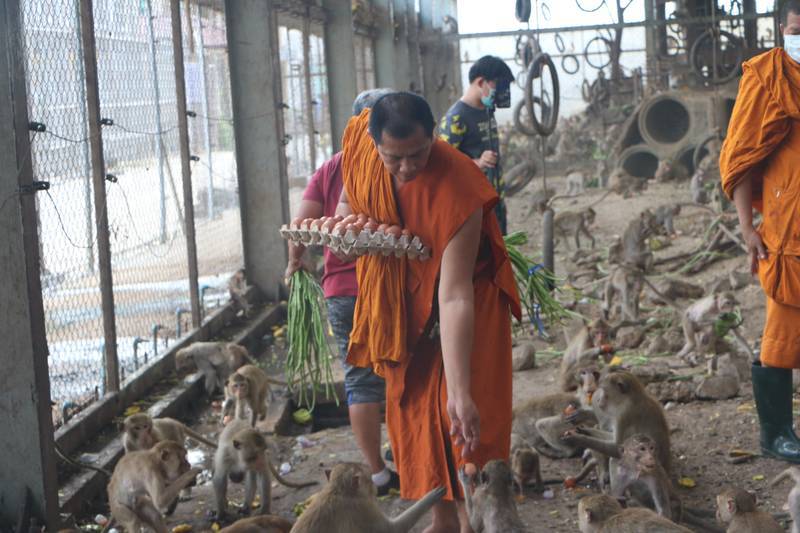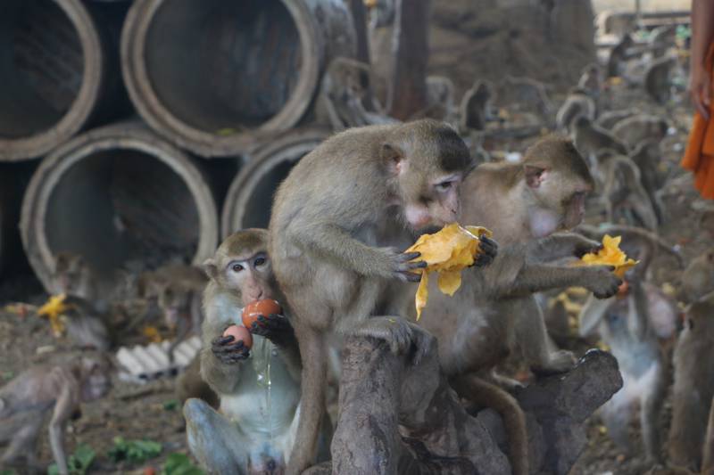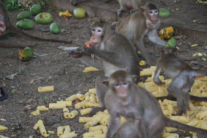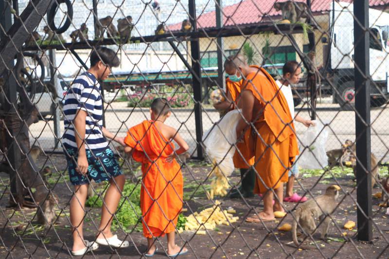 นำอาหาร เช่นผลไม้ ผัก มาจากการท่อผ้าป่าอาหารลิงทุกวันเสาร์ นำมาเลี้ยงลิง