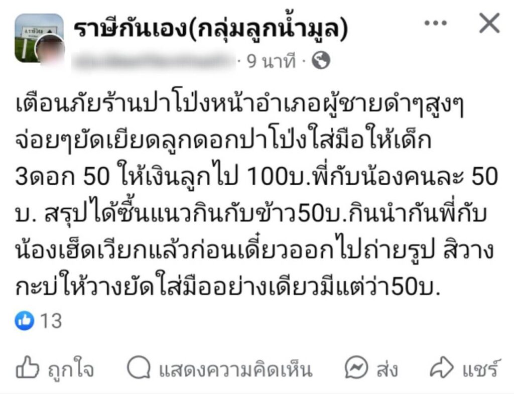 ขณะที่มีชาวบ้านรายหนึ่ง ได้โพสต์ข้อความผ่านเพจชื่อดังใน อ.ราษีไศล ในลักษณะร้องเรียนผ่านสื่อข้อความระบุว่า “เตือนภัยร้านปาโป่งหน้าอำเภอ ผู้ชายดำๆสูงๆ จ่อยๆ ยัดเยียดลูกดอกปาโป่งใส่มือให้เด็ก 3 ดอก 50 ให้เงินลูกไป 100 บ. พี่กับน้อง คนละ 50 บ. สรุปได้ซื้อแนวกินกับข้าว 50 บ. กินนำกันพี่กับน้อง เฮ็ดเวียกแล้วก่อน เดี๋ยวออกไปถ่ายรูป จะวางกะบ่ให้วาง ยัดใส่มืออย่างเดียว มีแต่ว่า 50 บ.”