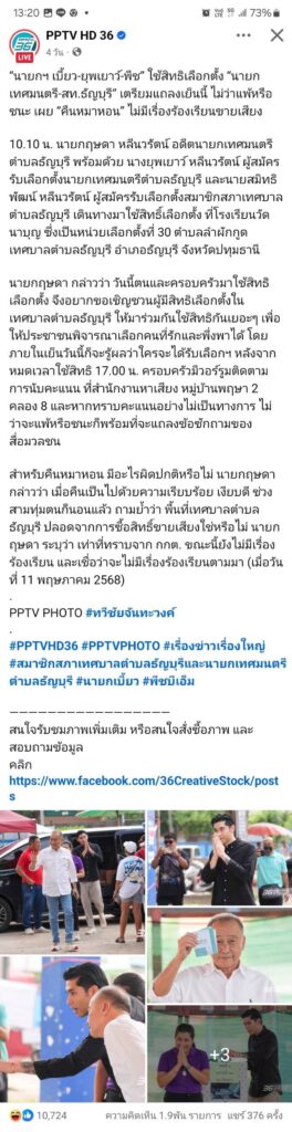 เมื่อเวลา 14.00 น. วันที่ 20 พฤษภาคม 2568 ที่ สำนักงานคณะกรรมการการเลือกตั้งประจำจังหวัดปทุมธานี เลขที่ 23 รังสิต-ปทุมธานี 10 ตำบล ประชาธิปัตย์ อ.ธัญบุรี จ.ปทุมธานี นายสมชาติ ค้าทันเจริญ อายุ 63 ปี ผู้สมัครนายกเทศมนตรีตำบลธัญบุรี หมายเลข 2 ได้เข้ามาร้องเรียนกับคณะกรรมการการเลือกตั้งประจำจังหวัดปทุมธานี ว่าในวันที่ 11 พฤษภาคม 2568 เวลา10.00.ที่ผานมาเป็นวันที่มีการเลือกตั้งนายกเทศมนตรีทั่วประเทศ อดีตนายกเบี้ยว นายกฤษฎา หลีนวรัตน์(นายกเทศมนตรีตำบลธัญบุรี) และ ภรรยา นางยุพเยาว์ หลีนวรัตน์ เลี้ยงสกุล ผู้สมัครนายกเทศมนตรีตำบลธัญบุรี หมายเลข 4 พร้อมด้วย บุตรชาย ลูกพีช นายสมิทธิพัฒน์ หลีนวรัตน์ ผู้สมัคร สท.ธัญบุรี เขต 2 นายไพโรจน์ กล้าหาญ ผู้สมัคร สท.ธัญบุรี เขต 2 ได้ยืน จากนั้นทั้งสามคนได้เดินมา รออยู่ข้างรถ ทั้งหมดโดยสารรถตู้สีดำเมื่อประตูรถหลังด้านซ้ายเปิด มีนายกฤษดาหรือเบี้ยว หลีนวรัตน์ เดินลงคนแรกแล้วยกมือไหว้ไปรอบๆ หน่วยเลือกตั้งทักทายประชาชน โดยมีนางยุพเยาว์หรือน้ำอ้อย และนาย สมิทธิพัฒน์หรือ พีชเดิมตามกันลงมา เมื่อลงมาจากรถทั้งหมดแล้วนายกฤษดาหรือเบี้ยวได้ยกมือข้างขวาระดับหัวไหล่และชู 4 นิ้ว ลักษณะเป็นการหาเสียง ให้นาง ยุพเยาว์บริเวณในหน่วยเลือกตั้ง ผิดข้อกฎหมายการเลือกตั้งแล้วพากันเดินไปประมาณ3-4ก้าวถึงกระดานประกาศรายชื่อผู้สมัคร เมื่อเข้าใช้สิทธิ์เลือกตั้งแล้วทั้ง3 คนทั้งได้มายืนให้สัมภาษณ์ สื่อมวลชน ในลักษณะโฆษณาเชิญชวน ซึ่งสามารถเห็นได้ตามสื่อต่างๆ ทั้งโทรทัศน์ และ สื่อออนไลน์