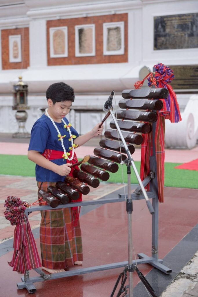 จากนั้นได้รับเกียรติจาก โอ๊ต-สิทธิพงษ์ และ มายด์-กัญญาณัฐ ศิลปินจากค่ายอ่องหล่องมิวสิค (รถแห่จงเจริญ) โดยสองผู้บริหาร คุณบรรจง จันทร์เทพ และ คุณอังคาร ปะระทัง ถวายเสียงแด่องค์พระธาตุนาดูน เพื่อเป็นพุทธบูชา ร่วมด้วยการถวายเสียงโปงลาง ในเพลง “นกไซบินข้ามทุ่ง” โดย น้องริว-เด็กชายพัทธ์ กระต่ายจันทร์ จากสถาบัน M BEVER STUDIO โดย คุณชญาภา บีเวอร์ และการรำถวายพระธาตุนาดูน โดย มาดามเพี๊ยซ โดยมี อาจารย์วันชัย สุพรรณ ผู้เชี่ยวชาญด้านพระเครื่อง และ เจ้าของรายการ “คุยเฟื่องเรื่องพระ”, คุณอาทร ต้องมนต์ และ คุณชัชวาล นาไพศาล, จุรีรัตน์ชัยพรหมประสิทธิ์ และ สิริภัสร หมวดอ่อน เข้าร่วมกิจกรรมในครั้งนี้ด้วย เสร็จแล้วพระสงฆ์นำเดินวนรอบพระธาตุนาดูน จำนวน ๓ รอบ และช่วยกันห่มผ้าพระธาตุนาดูนเป็นอันเสร็จพิธี