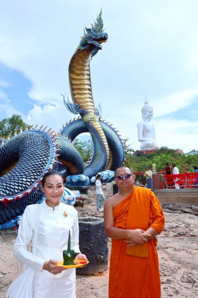 จากนั้น พระมหานันทนการณ์ ธีรวโร ดร. นำคณะศิลปินดาราจิตอาสา เข้ากราบ :องค์พญาศรีมุกดามหามุนีนีลปาลนาคราช” ถวายกรวยดอกไม้ ผูกผ้าแดง ตั้งจิตอธิษฐานขอความเป็นสิริมงคลให้กับตัวเองและครอบครัวสืบไป!!!