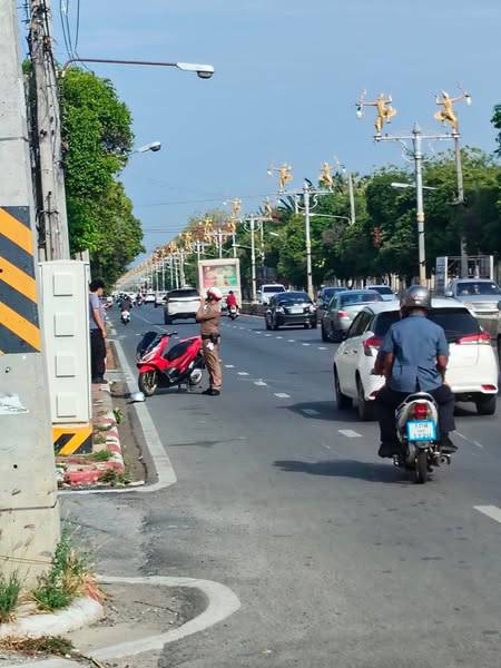 พร้อมระบุข้อความว่าเกิดอะไรขึ้น หน้าชุมชนไปรษณีย์ลพบุรี ใครพอทราบ รายละเอียด ช่วยอธิบายหน่อยครับ รถ มอไซค์ PCX สีแดง ล้ม คาดว่าจะเป็นเด็กนักเรียนเทคนิค เป็นผู้ขับขี่ มีตำรวจจราจร เดินตามไปที่รถล้ม