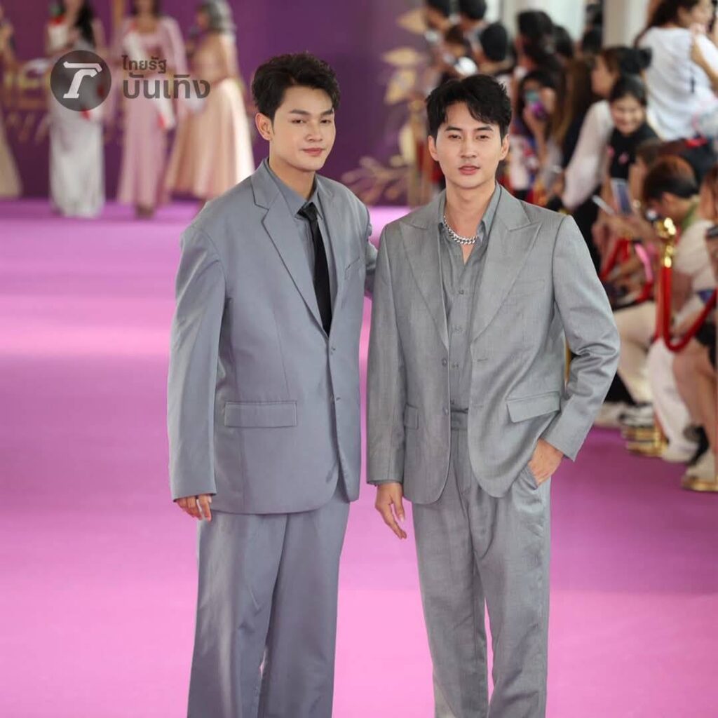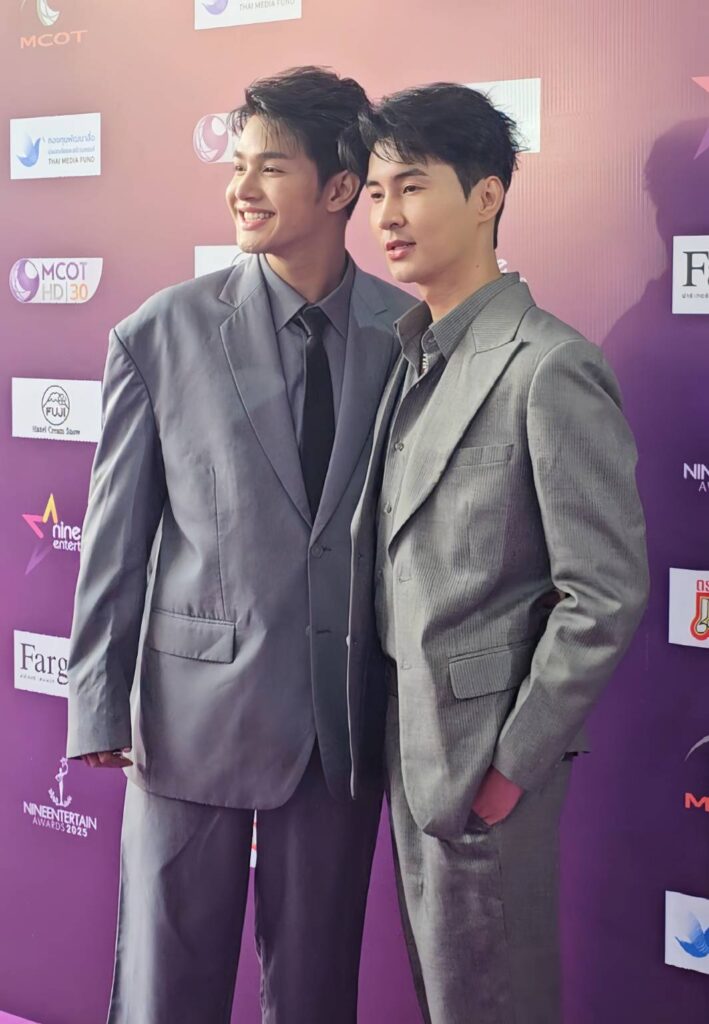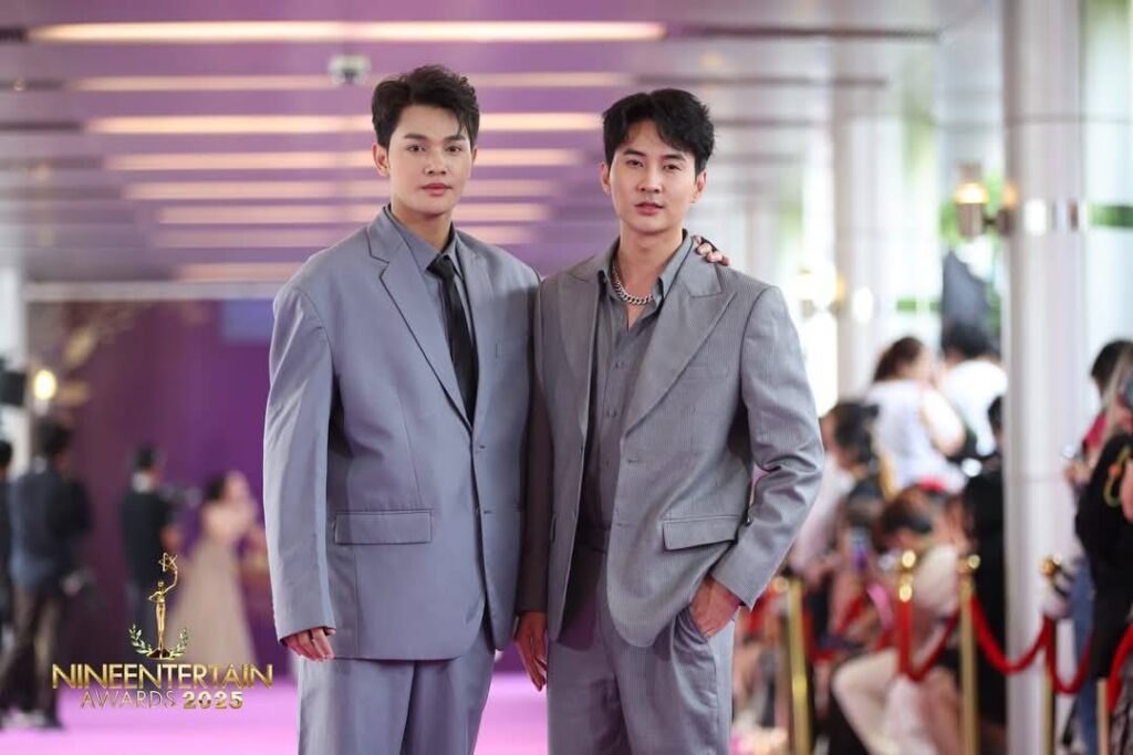 สองนักแสดงหนุ่ม “เล้ง ณัฐพล” และ “แสตมป์ พรวศิน” คู่จิ้นมาแรงจากซีรีส์วายพีเรียดย้อนยุค “ลอยแก้ว Loy Kaew First Love” ปรากฏตัวสุดปังบนพรมม่วงในงาน Nine Entertain Awards 2025 สะกดทุกสายตาด้วยลุคสูทสีเทาคู่ พร้อมรอยยิ้มละลายใจแฟน ๆ ท่ามกลางเสียงเชียร์และกล้องสื่อมวลชนที่จับจ้องตลอดทางเดิน