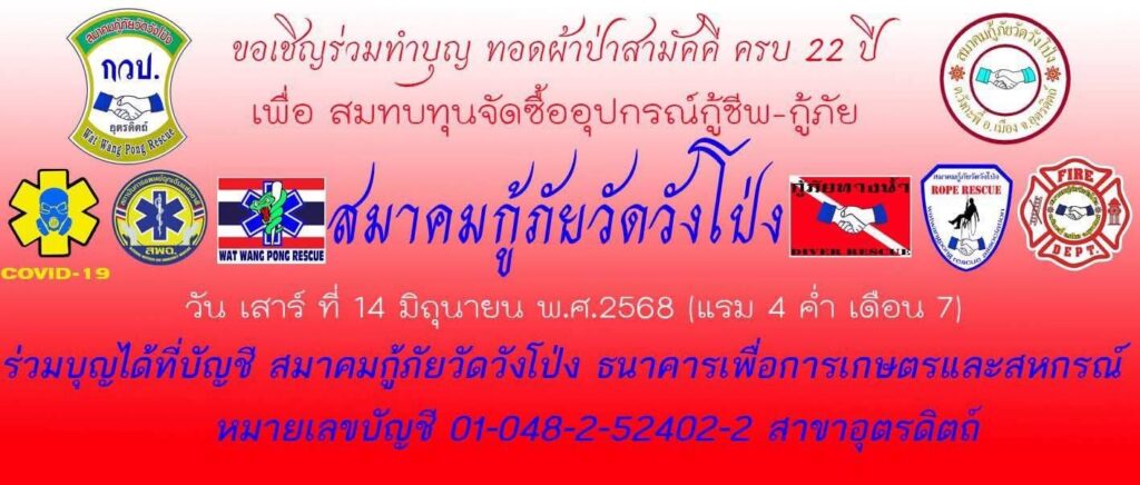 สมาคมกู้ภัยวัดวังโป่ง จึงขอเชิญชวนทุกท่านร่วมบุญใหญ่ในครั้งนี้ โดยมีรายละเอียดดังนี้: