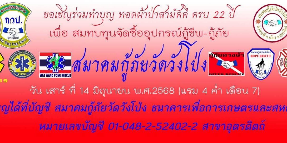 บ้านวังโป่ง , อุตรดิตถ์, สมาคมกู้ภัยวัดวังโป่ง ขอเรียนเชิญพุทธศาสนิกชนและผู้ใจบุญทุกท่าน ร่วมทำบุญทอดผ้าป่าสามัคคีประจำปี เนื่องในโอกาสครบรอบ 22 ปี ของการก่อตั้งสมาคมฯ เพื่อระดมทุนจัดซื้ออุปกรณ์กู้ชีพ-กู้ภัยที่ทันสมัย และเครื่องเรือยนต์ใหม่ ที่มีสมรรถนะสูง สามารถขับทวนกระแสน้ำที่เชี่ยวกรากได้อย่างมีประสิทธิภาพ เพื่อยกระดับศักยภาพในการเข้าช่วยเหลือพี่น้องประชาชนที่ประสบภัยน้ำท่วม ทั้งในจังหวัดอุตรดิตถ์และจังหวัดใกล้เคียงได้อย่างทันท่วงทีและปลอดภัยยิ่งขึ้น