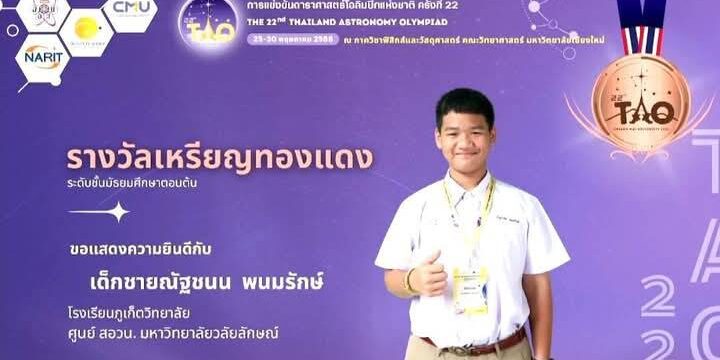 เด็กชายณัฐชนท์ พรหมรักษ์ ขอบพระคุณคณะครูและทุกท่านที่ให้ความรู้พร้อมสนับสนุนจนได้เข้าร่วมการแข่งขันดาราศาสตร์โอลิมปิกแห่งชาติ The 22nd Thailand Astronomy Olympiad