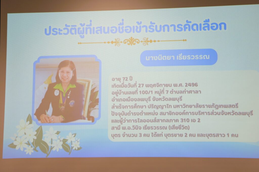 ซึ่งผลการ พิจารณาคัดเลือกแม่ดีเด่นแห่งชาติประจำปี 2568 ของจังหวัดลพบุรีได้แก่นางนิตยา เธียรวรรณ อายุ 72 ปี ภูมิลำเนาเลขที่ 100/1 หมู่ที่ 7 ตำบลท่าศาลา อำเภอเมืองลพบุรี จังหวัดลพบุรี เป็นประเภทแม่บำเพ็ญประโยชน์ต่อสังคม