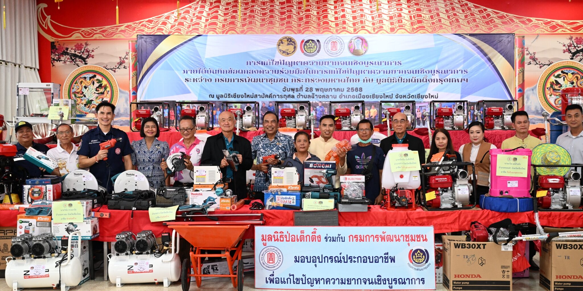 โครงการแก้ไขปัญหาความยากจนเชิงบูรณาการ มูลนิธิป่อเต็กตึ๊ง ได้สนับสนุนอุปกรณ์ประกอบอาชีพ ช่วยเหลือครัวเรือนยากจน ตามบันทึกข้อตกลงความร่วมมือแก้ไขปัญหาความยากจน ระหว่างกรมการพัฒนาชุมชนและมูลนิธิป่อเต็กตึ๊ง ซึ่งมูลนิธิฯ ได้จัดงบประมาณดำเนินการเพื่อจัดหาวัสดุอุปกรณ์ประกอบอาชีพมอบให้แก่ครัวเรือนยากจน ให้สามารถประกอบอาชีพเลี้ยงตนเองและครอบครัว โดยในกลุ่มเป้าหมายแรกดำเนินการในพื้นที่ภาคกลาง 17 จังหวัด รวม 98 ครัวเรือน ต่อมาได้ดำเนินการในพื้นที่จังหวัดทางภาคเหนือ 17 จังหวัด รวม 230 ครัวเรือน และภาคตะวันออกเฉียงเหนือ รวม 20 จังหวัด จำนวน 485 ครัวเรือน รวมดำเนินการไปแล้ว 3 ภาค รวม 54 จังหวัด 813 ครัวเรือน รวมงบประมาณกว่า 15.6 ล้านบาท