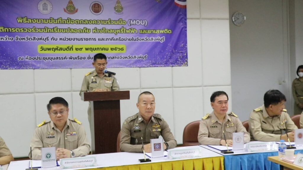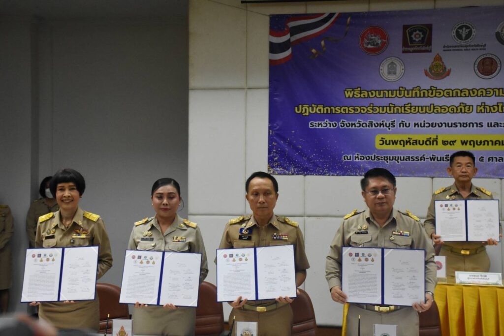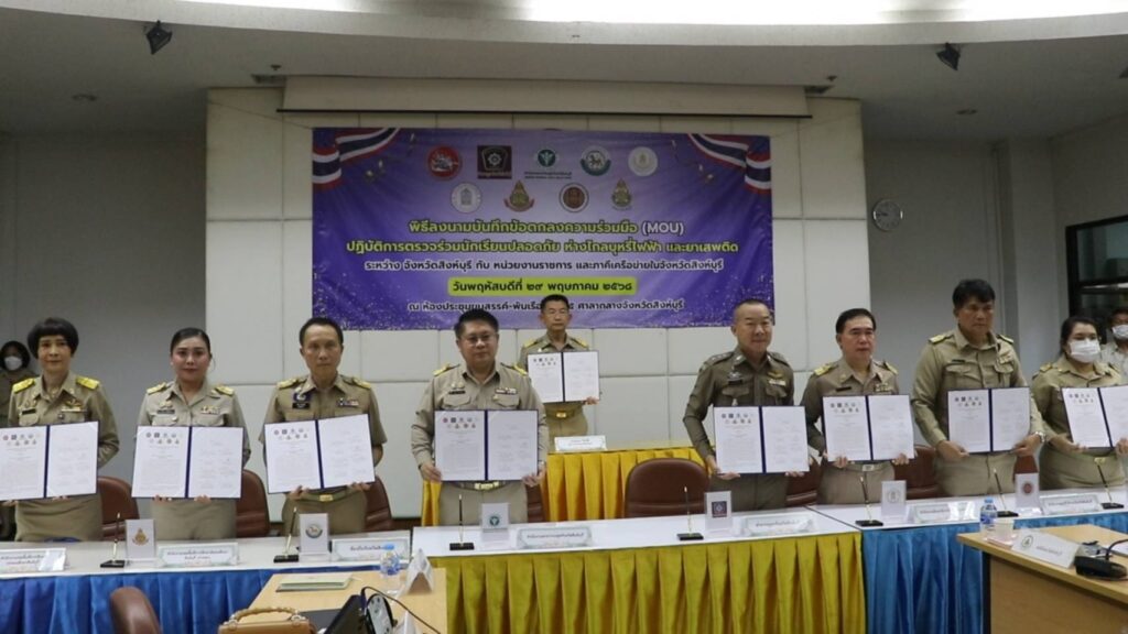 วันพฤหัสฯที่ 29 พฤษภาคม 2568 นายสุเมธ ธีรนิติผู้ว่าราชการจังหวัดสิงห์บุรี เป็นประธานพิธีลงนามบันทึกข้อตกลงความร่วมมือ (MOU)ปฏิบัติการตรวจร่วมนักเรียนปลอดภัยห่างไกลบุหรี่ไฟฟ้าและยาเสพติดระหว่างจังหวัดสิงห์บุรีกับหน่วยงานราชการและภาคีเครือข่ายในจังหวัด ณ ห้องประชุมขุนสรรค์ พันเรือง ชั้น 5 ศาลากลางจังหวัดสิงห์บุรี มีผู้ร่วมลงนามบันทึกข้อตกลงความร่วมมือ จำนวน 9 หน่วยงานประกอบด้วย ผู้ว่าราชการจังหวัดสิงห์บุรี นายแพทย์สาธารณสุขจังหวัดสิงห์บุรี ท้องถิ่นจังหวัดสิงห์บุรี ผู้บังคับการตำรวจภูธรจังหวัดสิงห์บุรี ศึกษาธิการจังหวัดสิงห์บุรี ผู้อำนวยการสำนักงานอาชีวศึกษา ผู้อำนวยการสำนักงานส่งเสริมการเรียนรู้จังหวัดสิงห์บุรี ผู้อำนวยการสำนักงานเขตพื้นที่การศึกษามัธยมศึกษาสิงห์บุรี-อ่างทองและสำนักงานเขตพื้นที่การศึกษาประถมศึกษาสิงห์บุรี