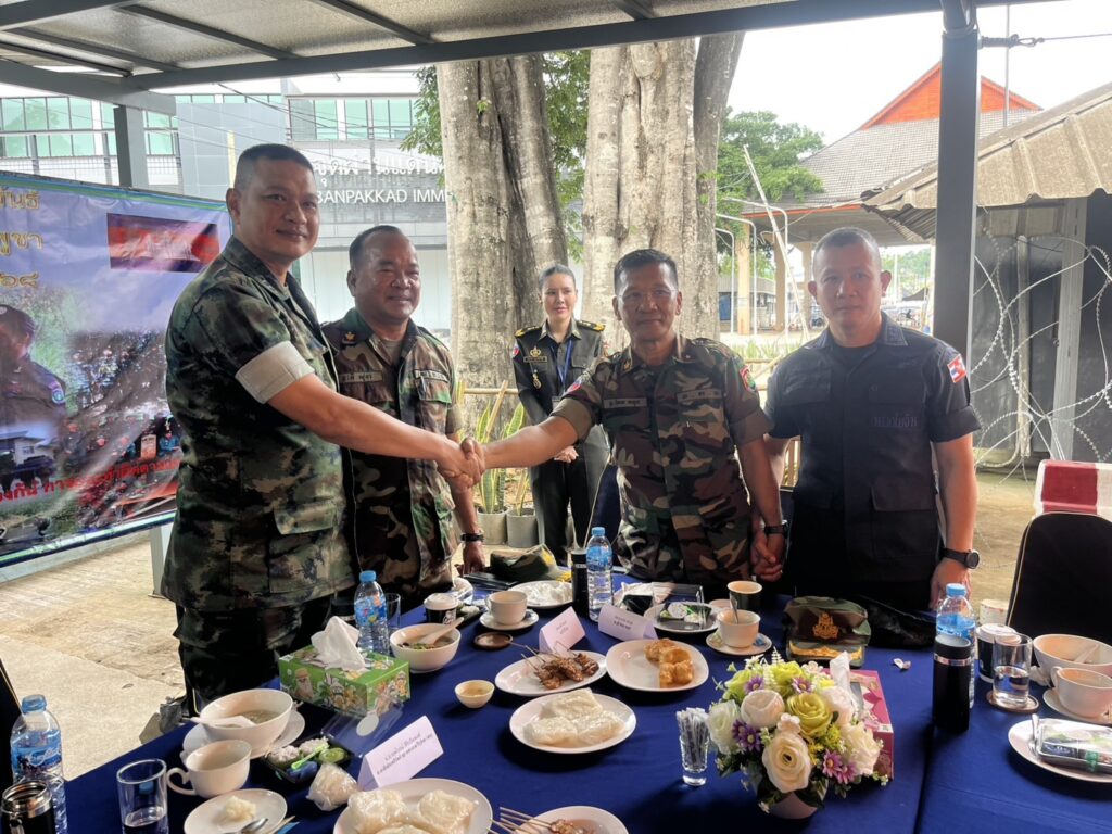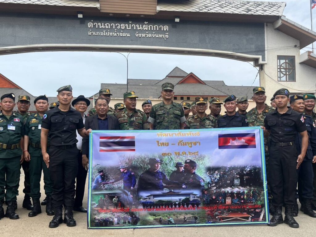 สำหรับสถานการณ์ชายแดนไทย-กัมพูชา ทางด้านชายแดนภาคตะวันออก เมื่อวันที่ 30 พฤษภาคม 2568 เวลา 07:30 น. ที่ผ่านมา ผู้สื่อข่าวรายงานความเคลื่อนไหวว่า บริเวณพรมแดนด่านถาวรบ้านผักกาด ตำบลคลองใหญ่ อำเภอโป่งน้ำร้อน จังหวัดจันทบุรี ซึ่งเป็น 1 ใน 5 จุดผ่านแดนถาวรระหว่างประเทศ อยู่ตรงข้ามกับบ้านปรม อำเภอศารากราว จังหวัดไพลิน ของกัมพูชา เจ้าหน้าที่ทหารฝ่ายไทย และกัมพูชา ถือโอกาสตั้งโต๊ะดื่มกาแฟ รับประทานอาหารเช้าร่วมกัน เพื่อยกระดับความสัมพันธ์ชายแดนจันทบุรี-กัมพูชา ให้แนบแน่น เป็นการลดการตึงเครียดจากกระแสข่าวที่เกิดขึ้น ที่บริเวณชายแดนช่องบก