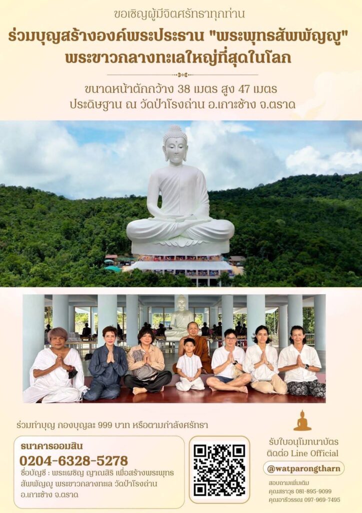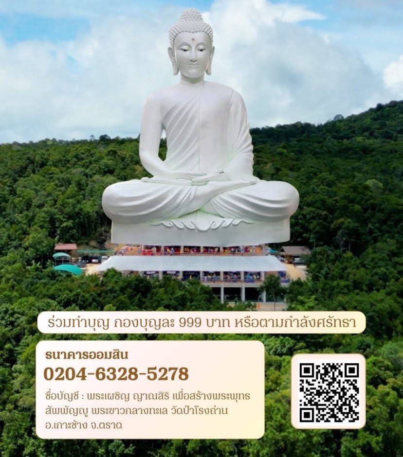 บัญชีธนาคารออมสิน เลขที่บัญชี 020463285278 ชื่อบัญชี: พระเผชิญ ญาณสิริ เพื่อสร้างพระพุทธสัพพัญญู พระขาวกลางทะเล วัดป่าโรงถ่าน อ.เกาะช้าง จ.ตราด