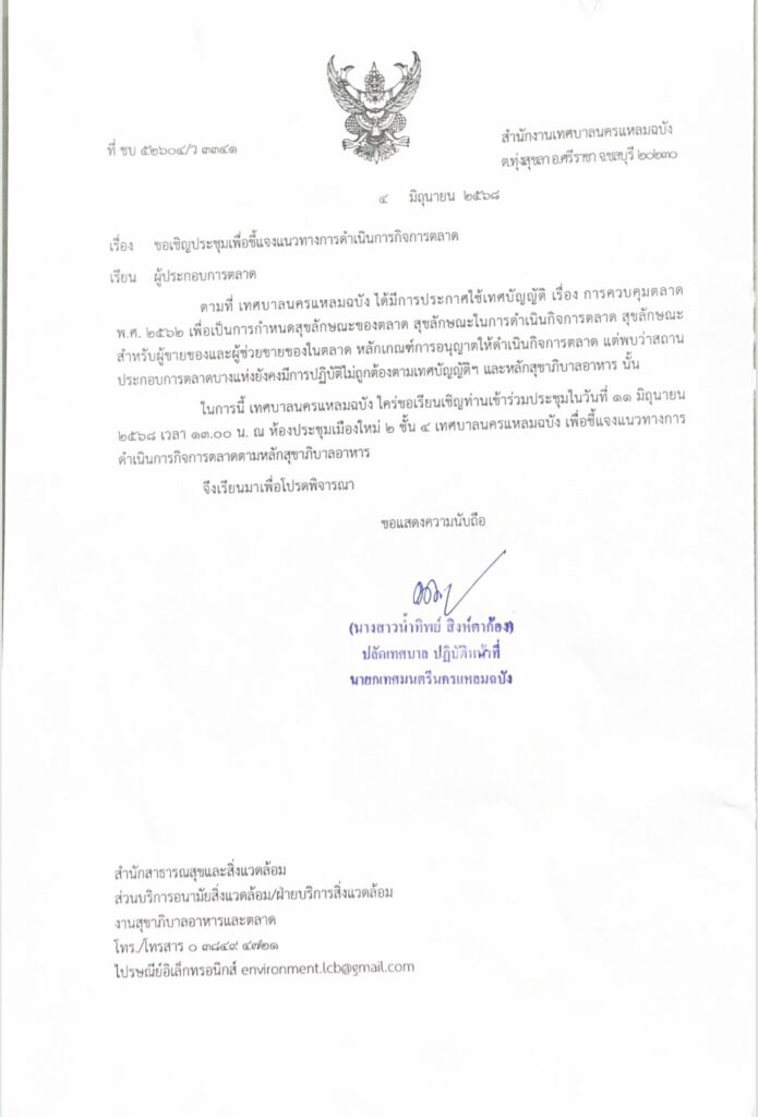 เมื่อเวลา 13.00 น.วันที่ 11 มิถุนายน 2568 ที่ห้องประชุมเมืองใหม่ 2 ชั้น 4 สำนักงานเทศบาลนครแหลมฉบัง อ.ศรีราชา จ.ชลบุรี นางสาวน้ำทิพย์ สิงห์ตาก้อง ปลัดเทศบาล ปฏิบัติหน้าที่นายกเทศมนตรีนครแหลมฉบัง ได้ออกหนังสือแจ้งผู้ประกอบการตลาด ให้มาร่วมประชุมเพื่อชี้แจงแนวทางการดำเนินการกิจการตลาด โดยมอบหมายให้นางมยุรีย์ เสนะโลหิต ผู้อำนวยการสำนักสาธารณสุขและสิ่งแวดล้อม ทำหน้าที่เป็นประธานในที่ประชุม เพื่อกำหนดสุขลักษณะของตลาด สุขลักษณะในการดำเนินกิจการตลาด รวมทั้งสุขลักษณะของผู้ขายและผู้ช่วยขายของในตลาด เนื่องจากพบว่ายังมีสถานประกอบการตลาดบางแห่งยังมีการปฏิบัติไม่ถูกต้องตามเทศบัญญัติฯ