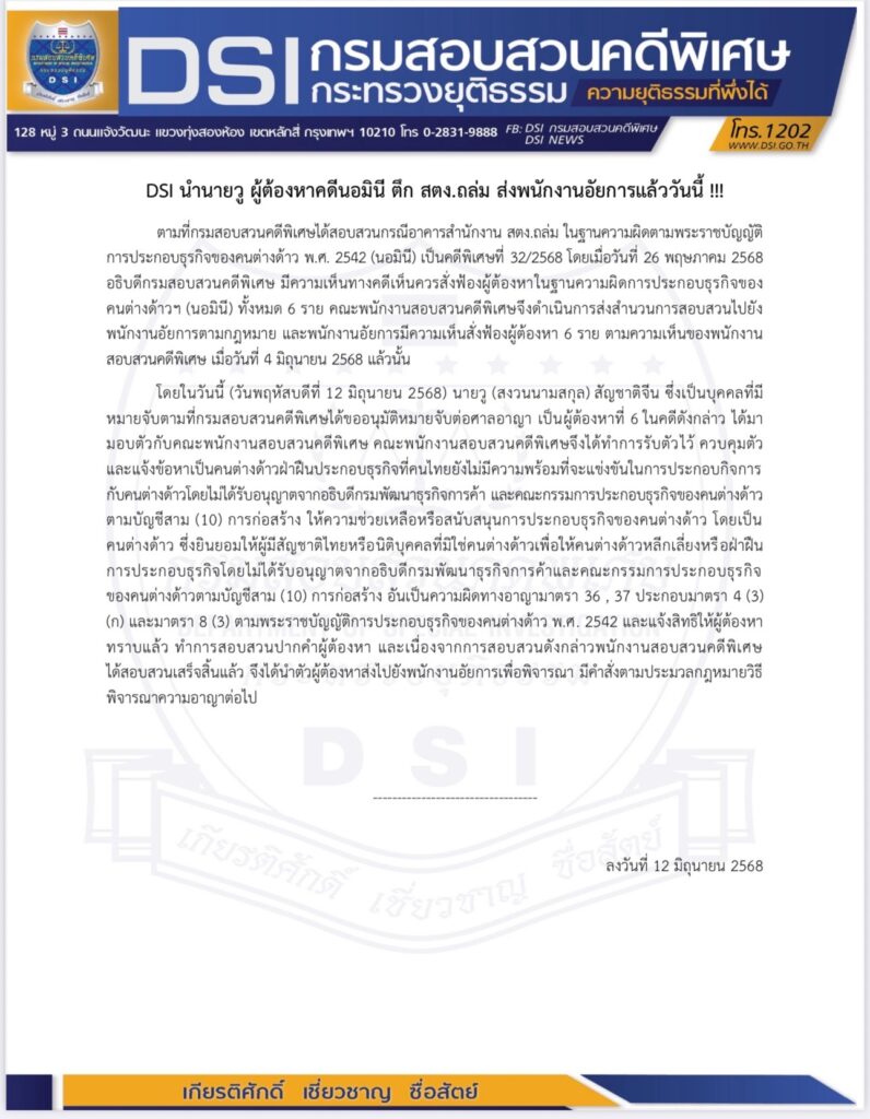 ตามที่กรมสอบสวนคดีพิเศษได้สอบสวนกรณีอาคารสำนักงาน สตง.ถล่ม ในฐานความผิดตามพระราชบัญญัติ การประกอบธุรกิจของคนต่างด้าว พ.ศ.2542 (นอมินี) เป็นคดีพิเศษที่ 32/2568 โดยเมื่อวันที่ 26 พฤษภาคม 2568 อธิบดีกรมสอบสวนคดีพิเศษ มีความเห็นทางคดีเห็นควรสั่งฟ้องผู้ต้องหาในฐานความผิดการประกอบธุรกิจของคนต่างด้าวฯ (นอมินี) ทั้งหมด 6 ราย คณะพนักงานสอบสวนคดีพิเศษจึงดำเนินการส่งสำนวนการสอบสวนไปยังพนักงานอัยการตามกฎหมาย และพนักงานอัยการมีความเห็นสั่งฟ้องผู้ต้องหา 6 ราย ตามความเห็นของพนักงานสอบสวนคดีพิเศษ เมื่อวันที่ 4 มิถุนายน 2568 แล้วนั้น